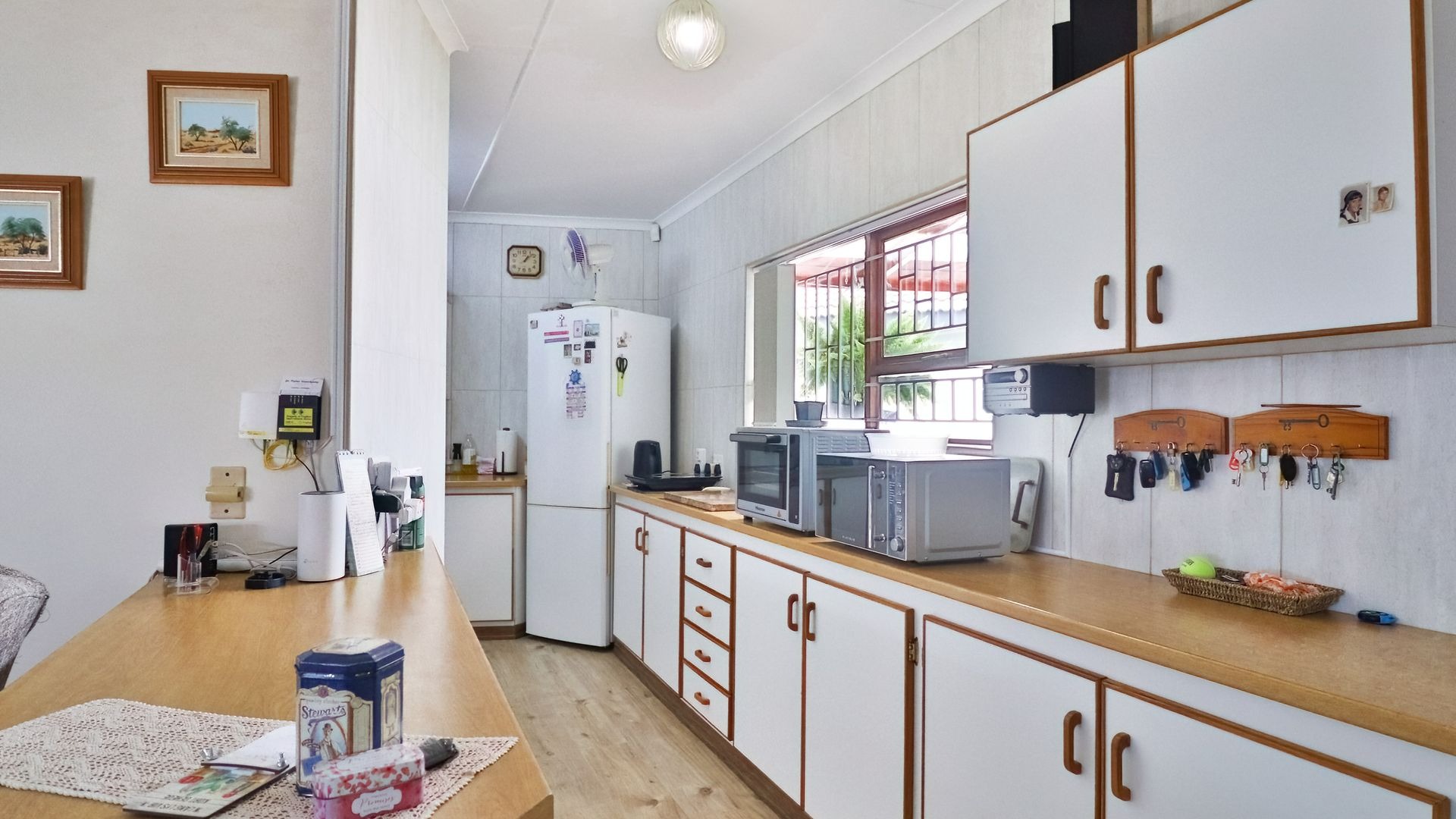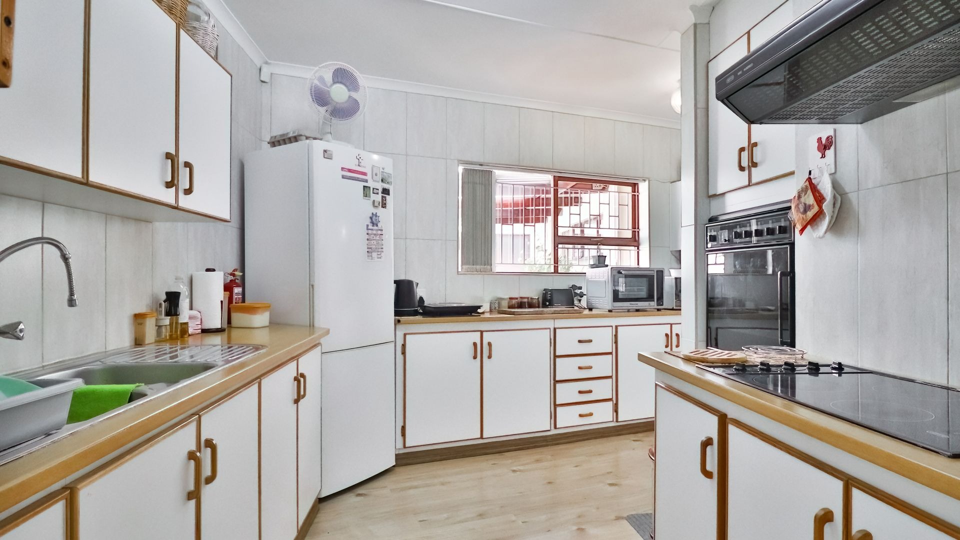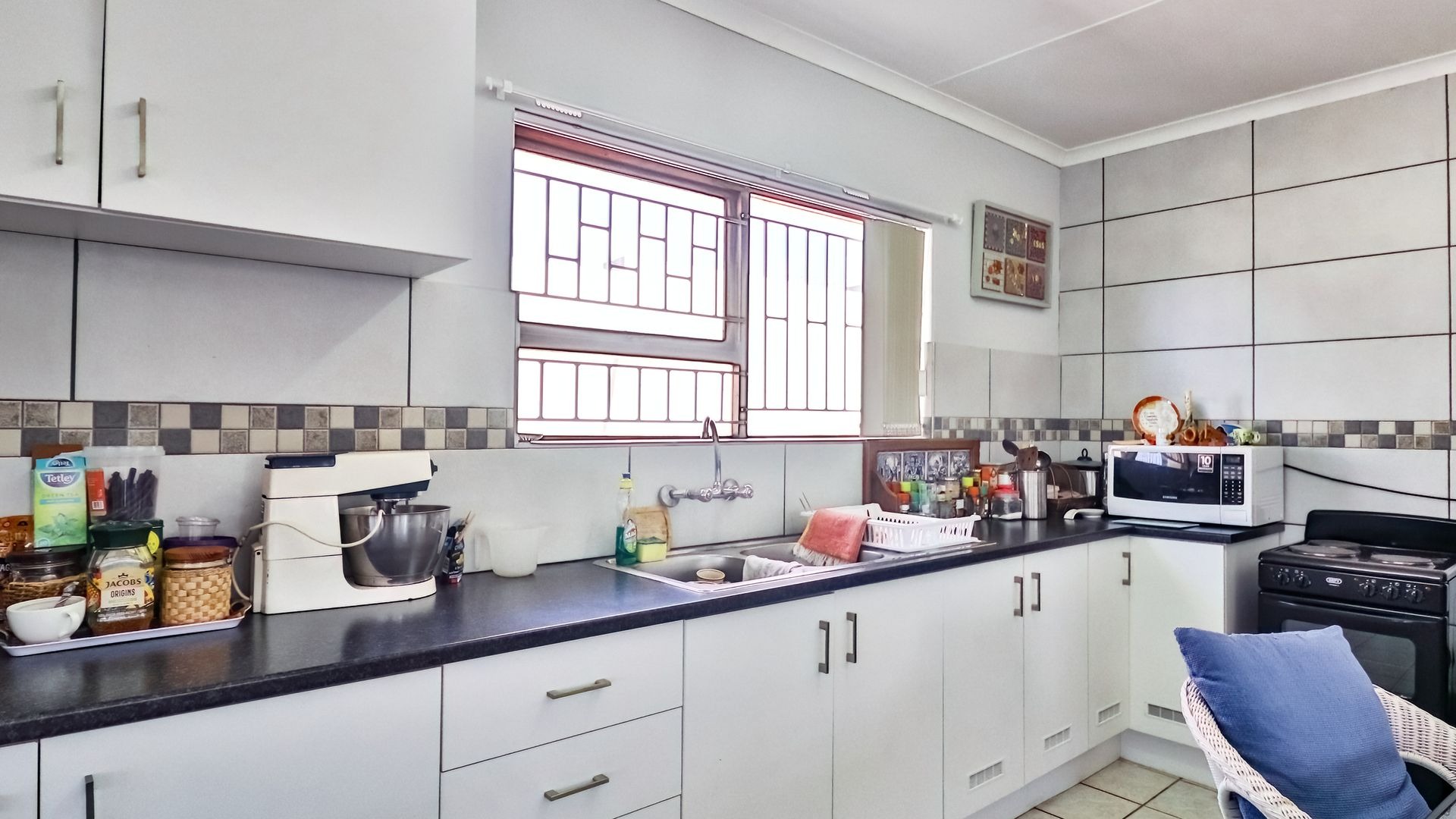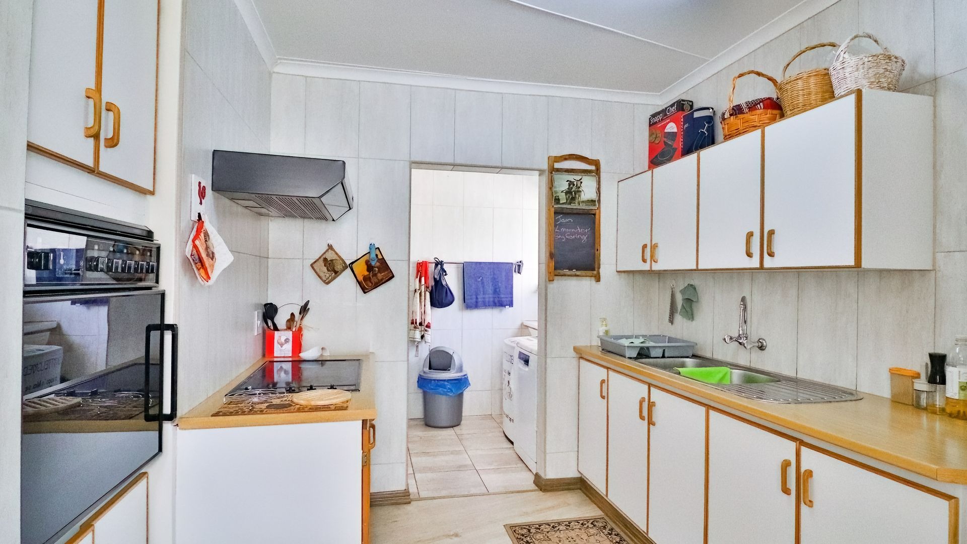Die kombuis is prakties en netjies deel van die oopplan met melamienkaste, elektriese stoof en oond, gelamineerde vloere, en toegang tot die patio.asook motorhuis.