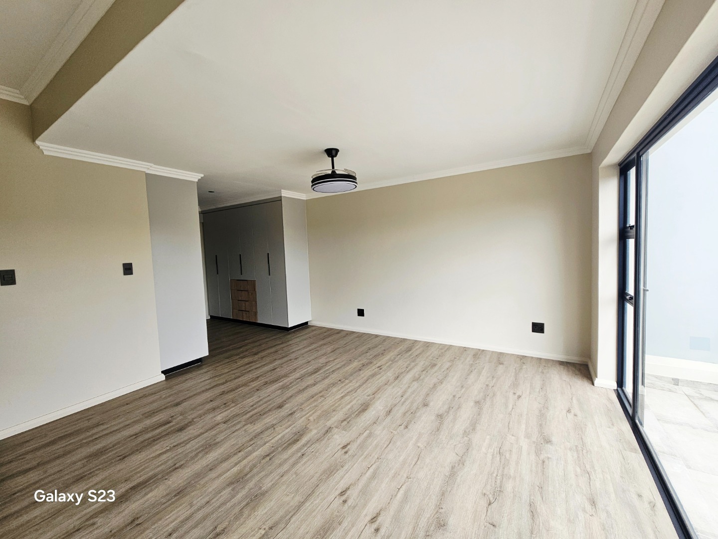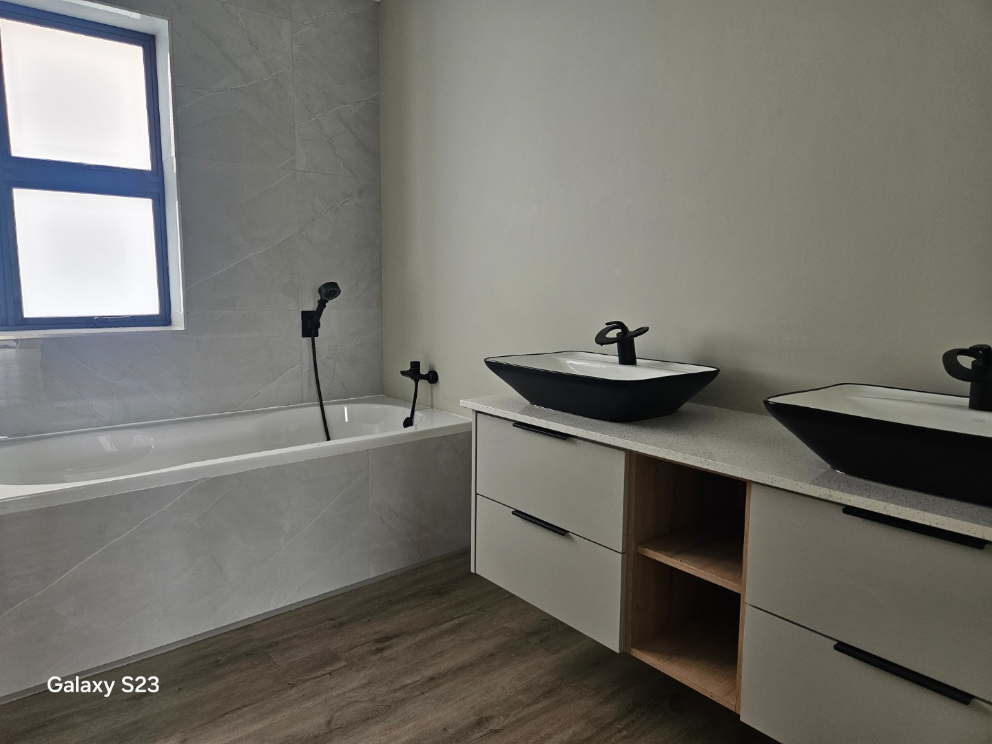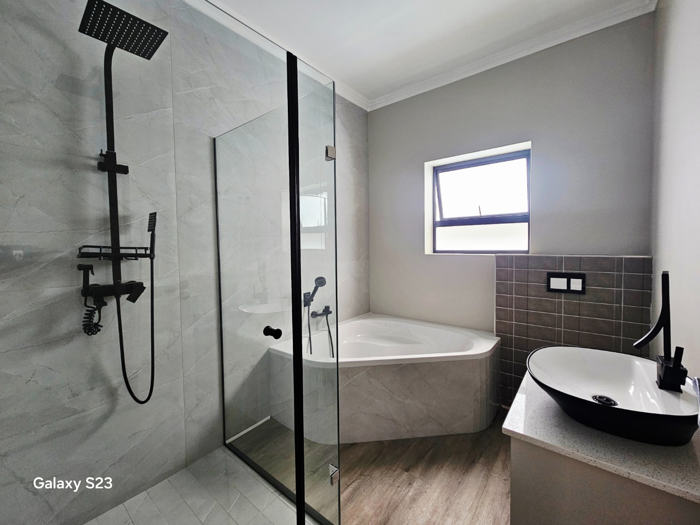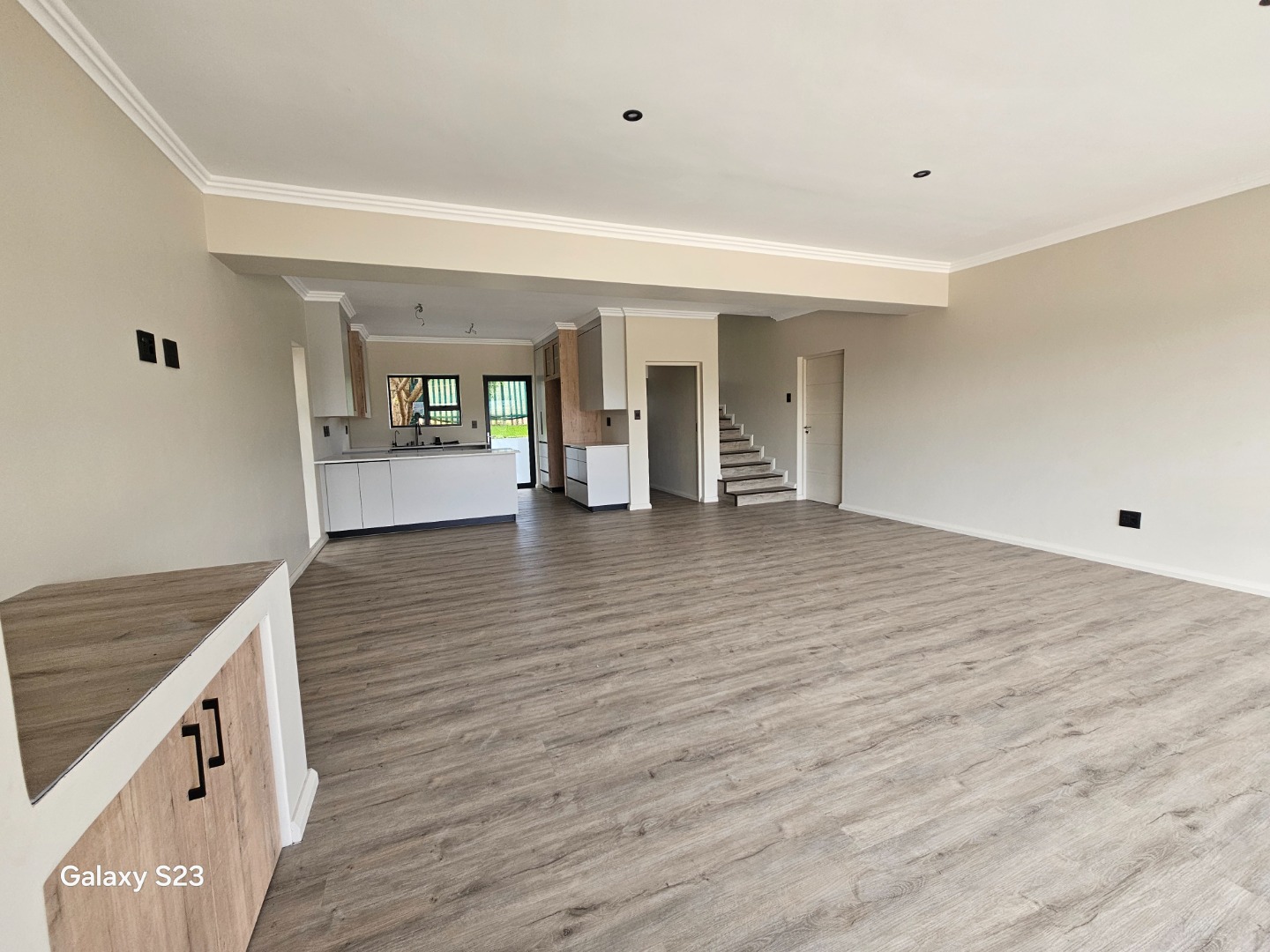 The built-in braai forms part of the open-plan living area and overlooks the river, making it ideal for relaxed entertaining with family and friends. The tandem garage comfortably accommodates two vehicles and is fitted with a high-quality belt-driven, dust-proof garage door. Soundproof windows ensure a peaceful indoor environment.