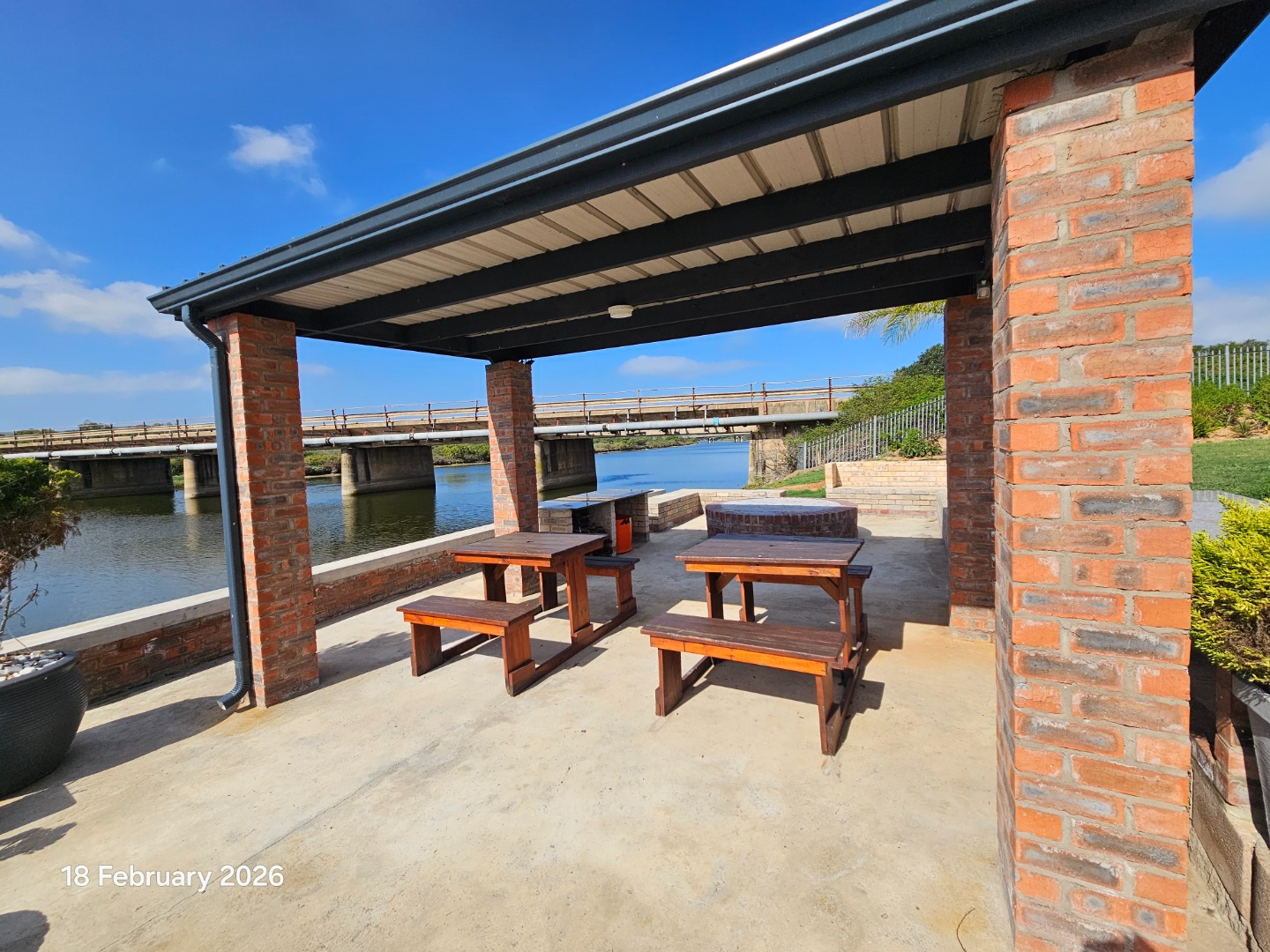 The built-in braai forms part of the open-plan living area and overlooks the river, making it ideal for relaxed entertaining with family and friends.