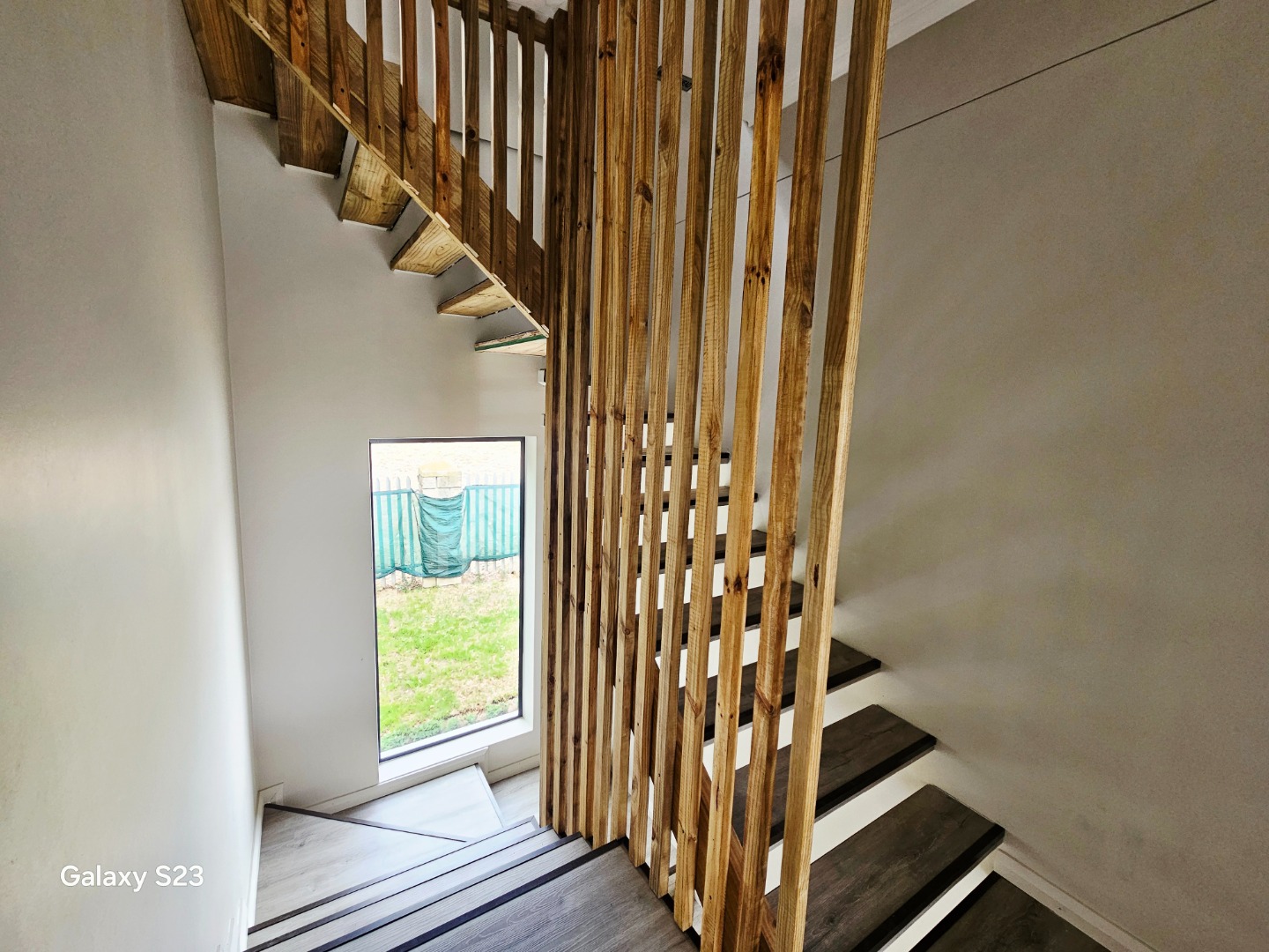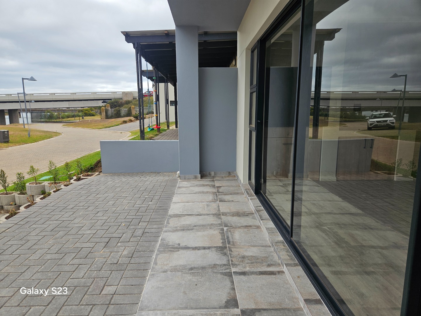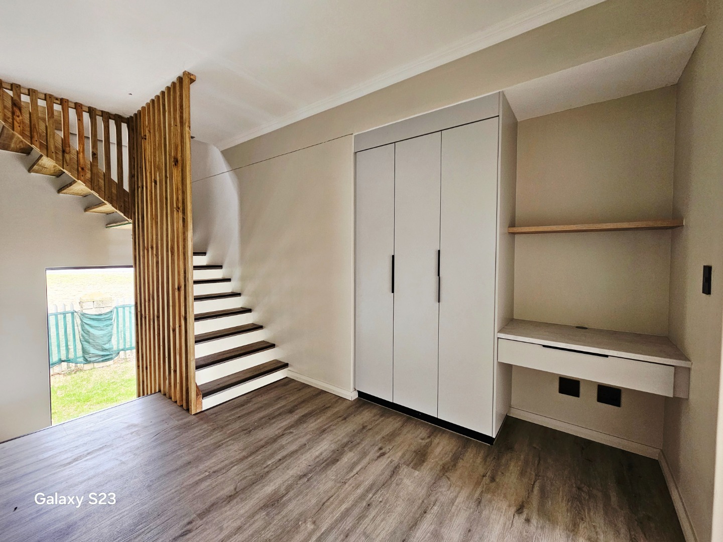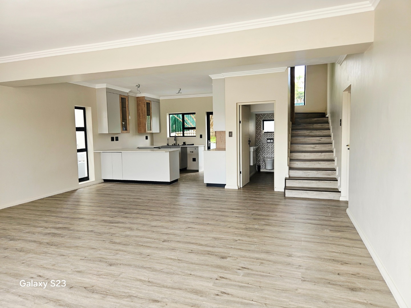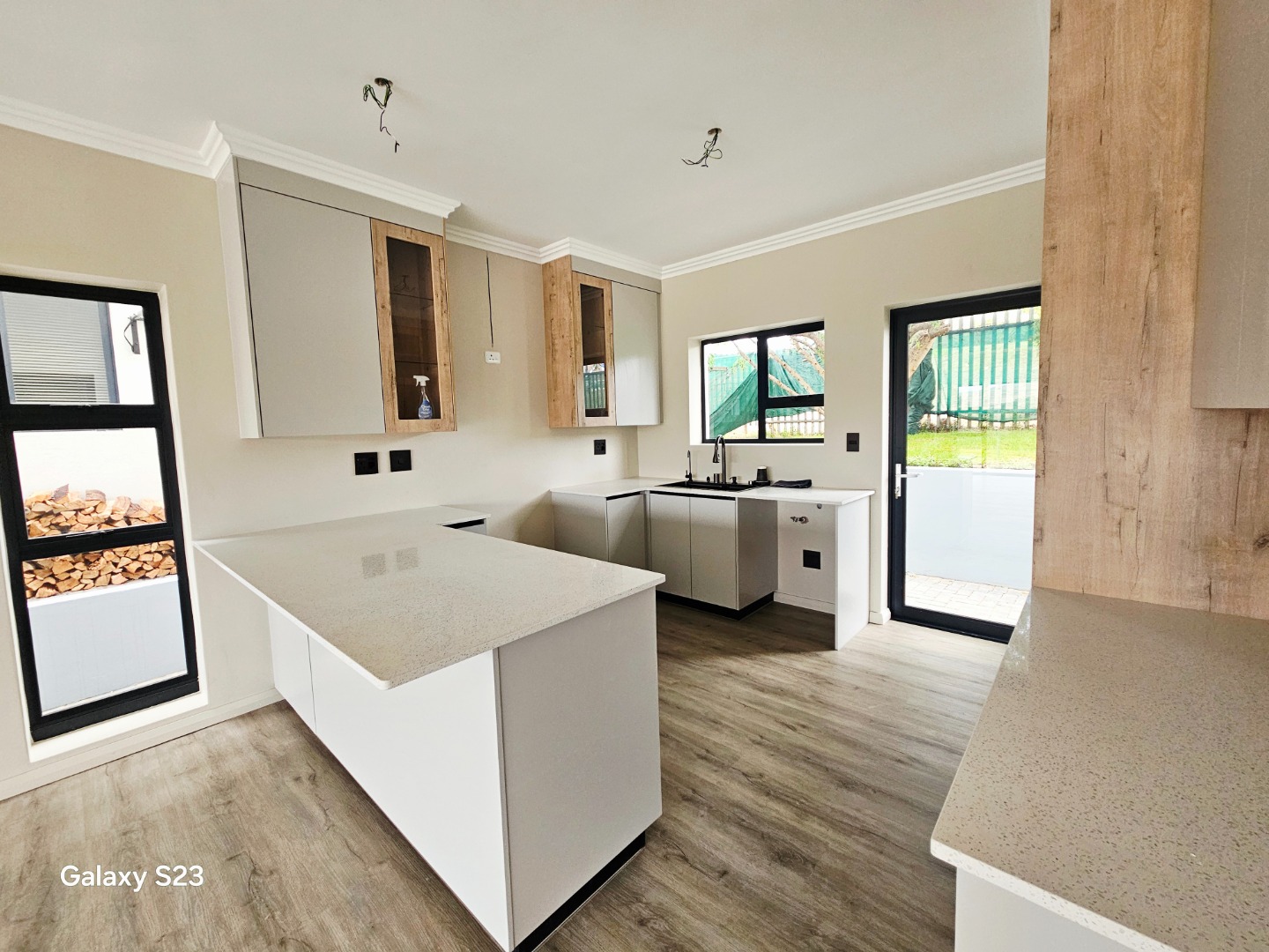 Located just three minutes from Hartenbos, the home features light, contemporary finishes throughout and a well-designed open-plan layout. The ground floor consists of a spacious living area incorporating a built-in braai, seamlessly flowing into the modern kitchen. A guest toilet adds convenience, while the kitchen provides direct access to a small private yard. An internal door leads to the tandem garage, which includes space for a washing machine.