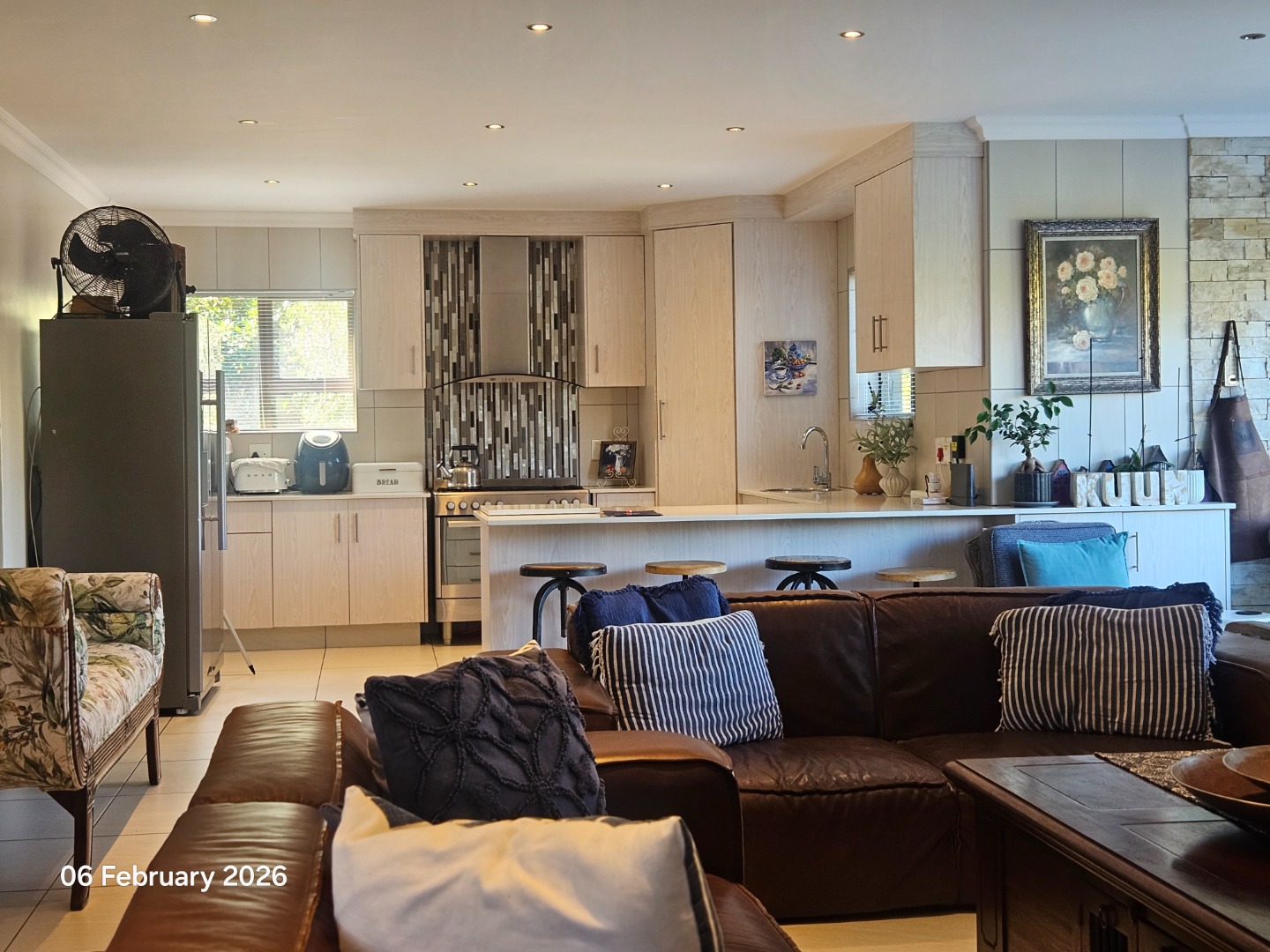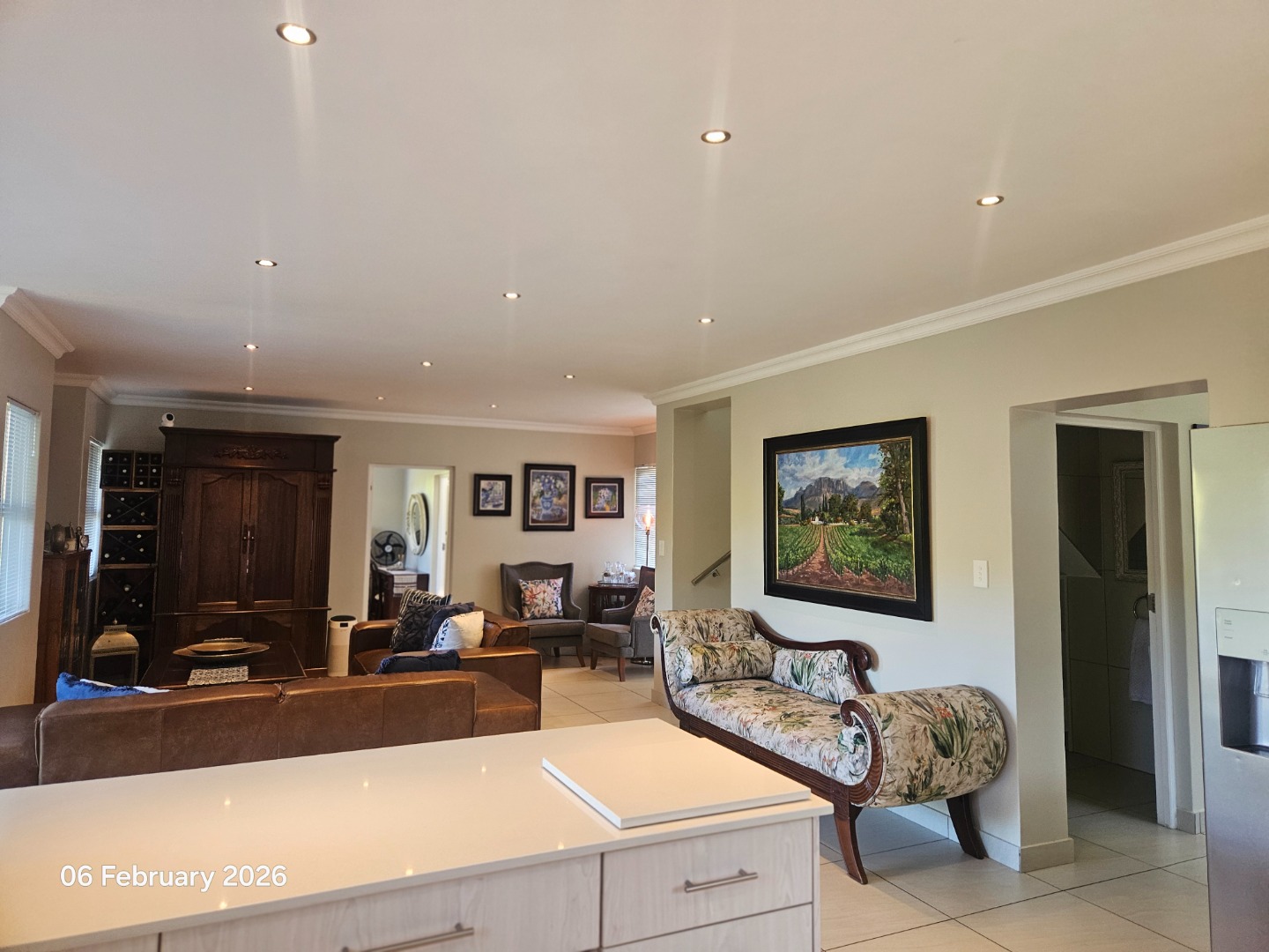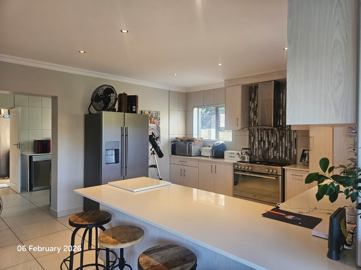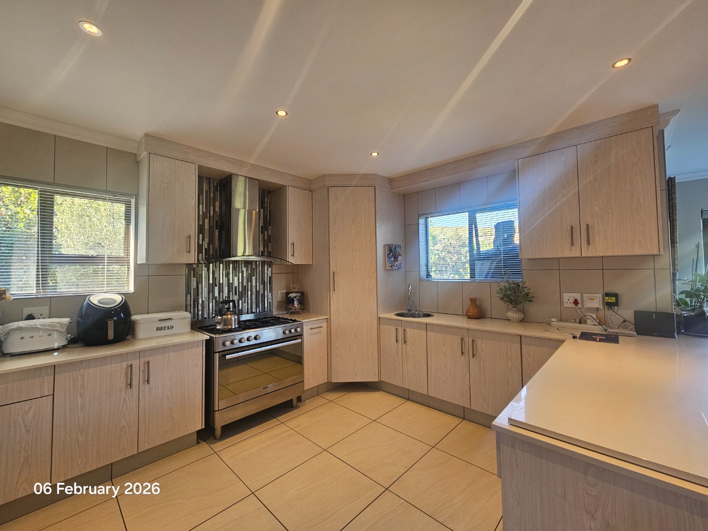 The kitchen is modern, fitted with granite tops and sleek cupboards, and complemented by a separate scullery and pantry.