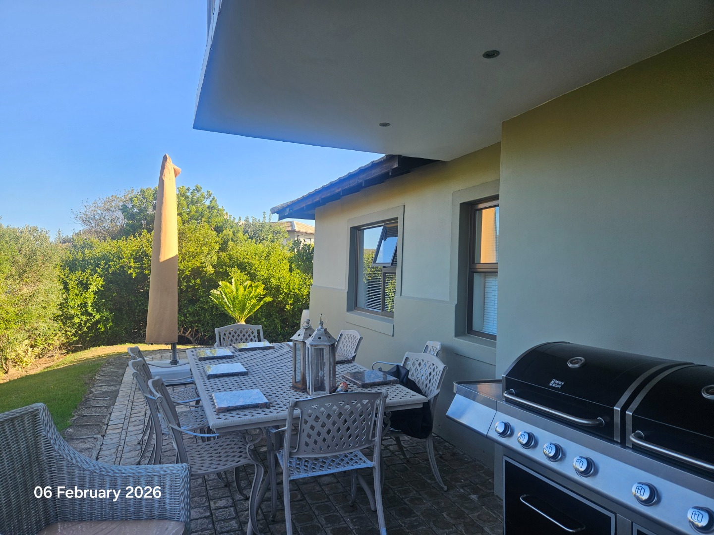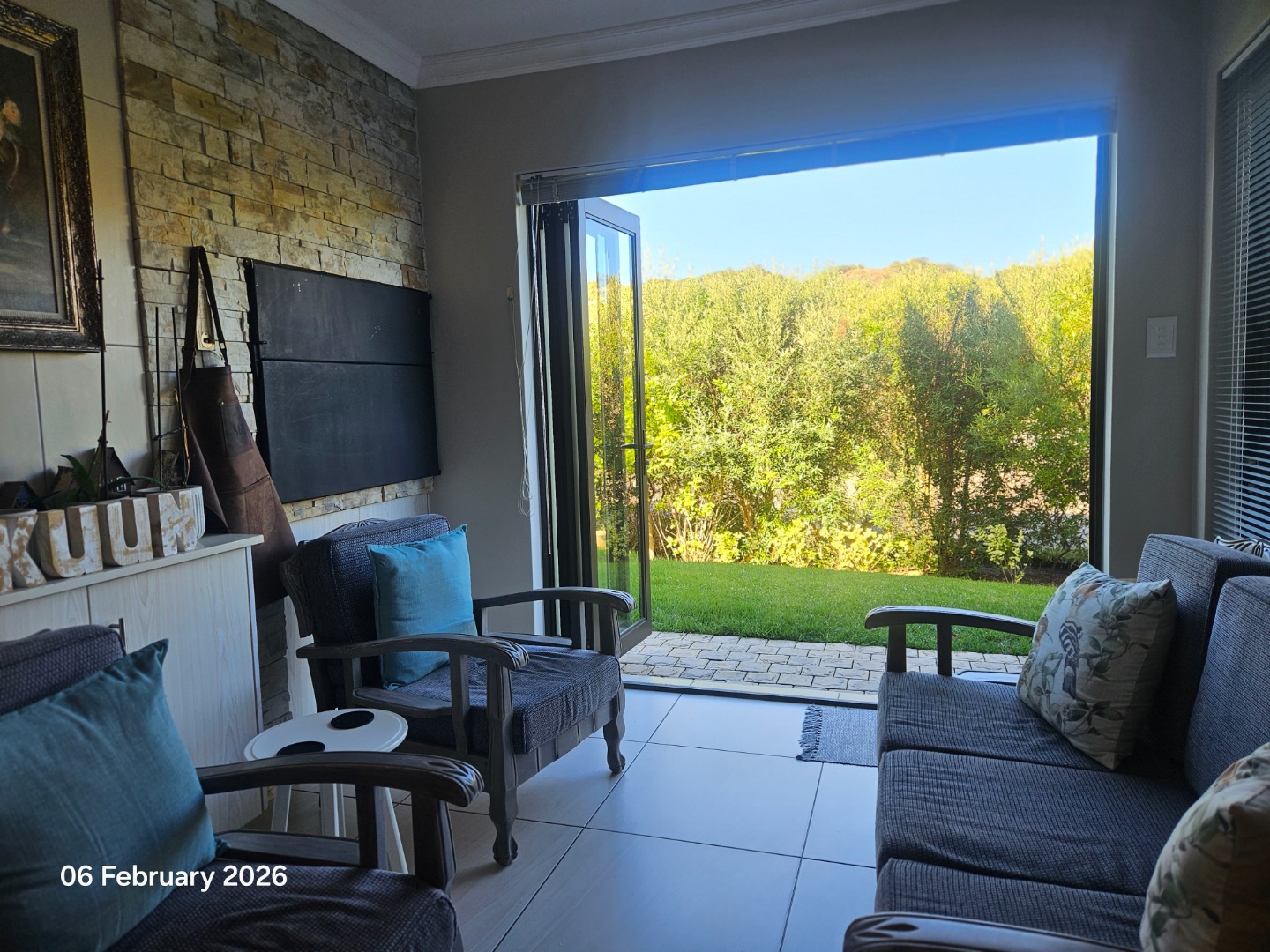 The TV lounge and dining area include a built-in braai, with stacking doors opening onto a beautifully maintained indigenous garden.