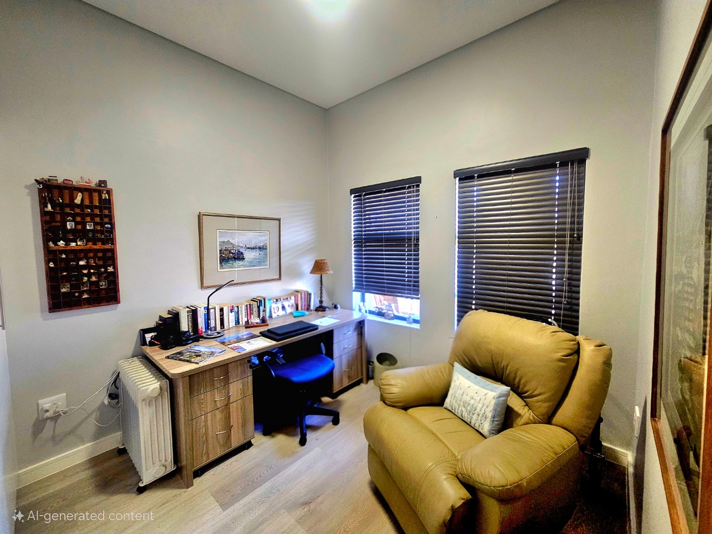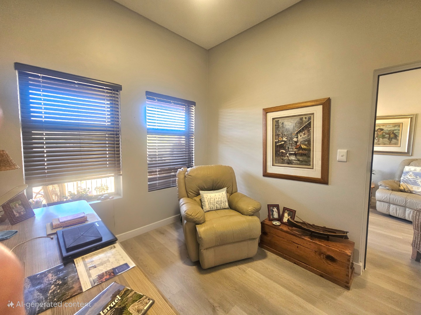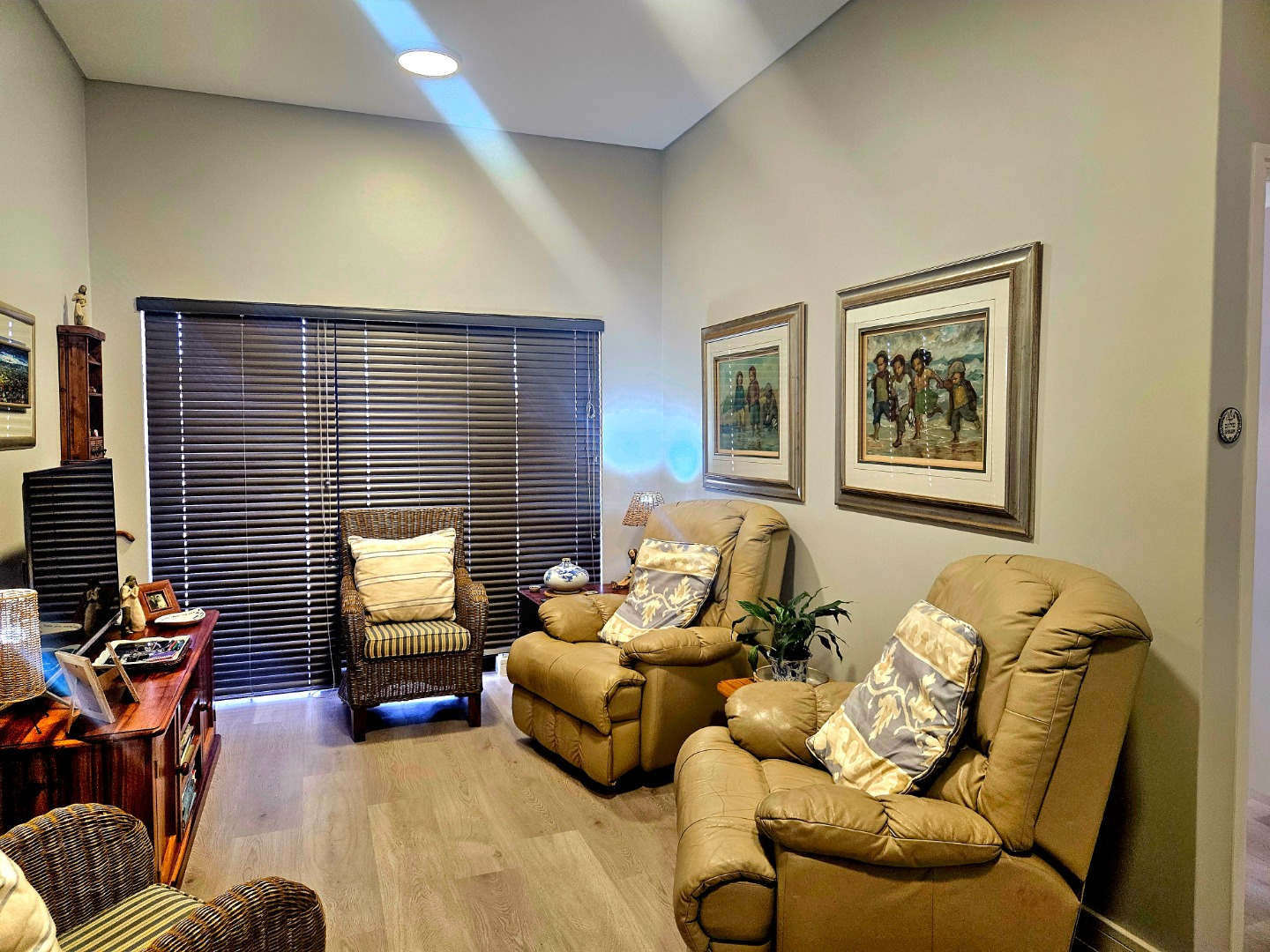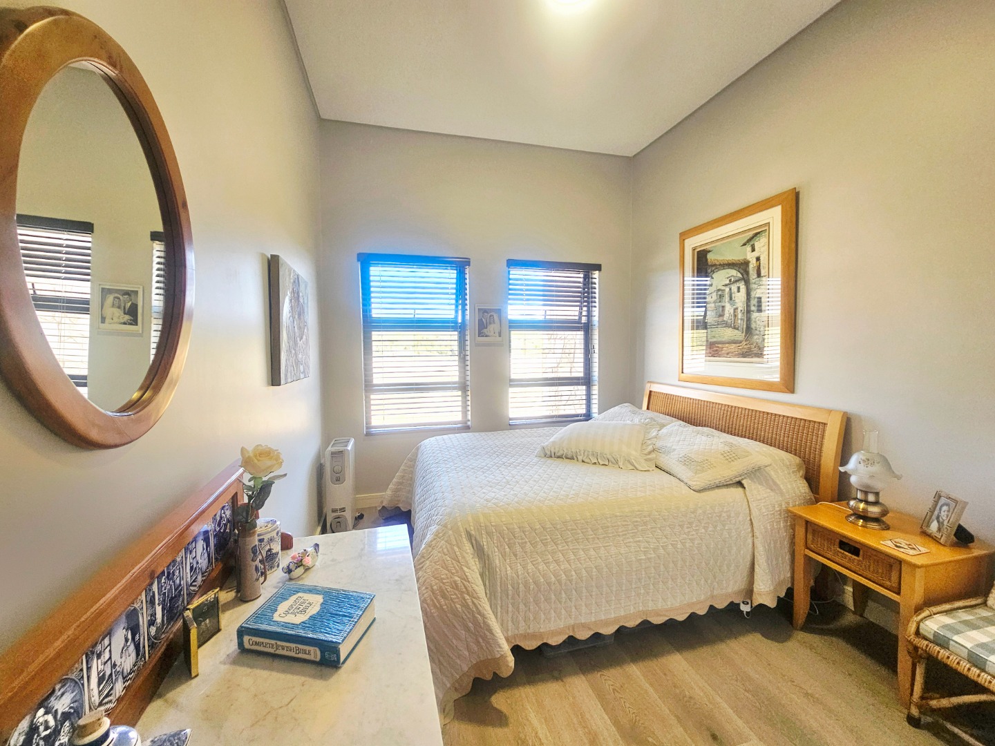 Thoughtfully upgraded with elegant laminated flooring, custom cupboards, and fitted blinds