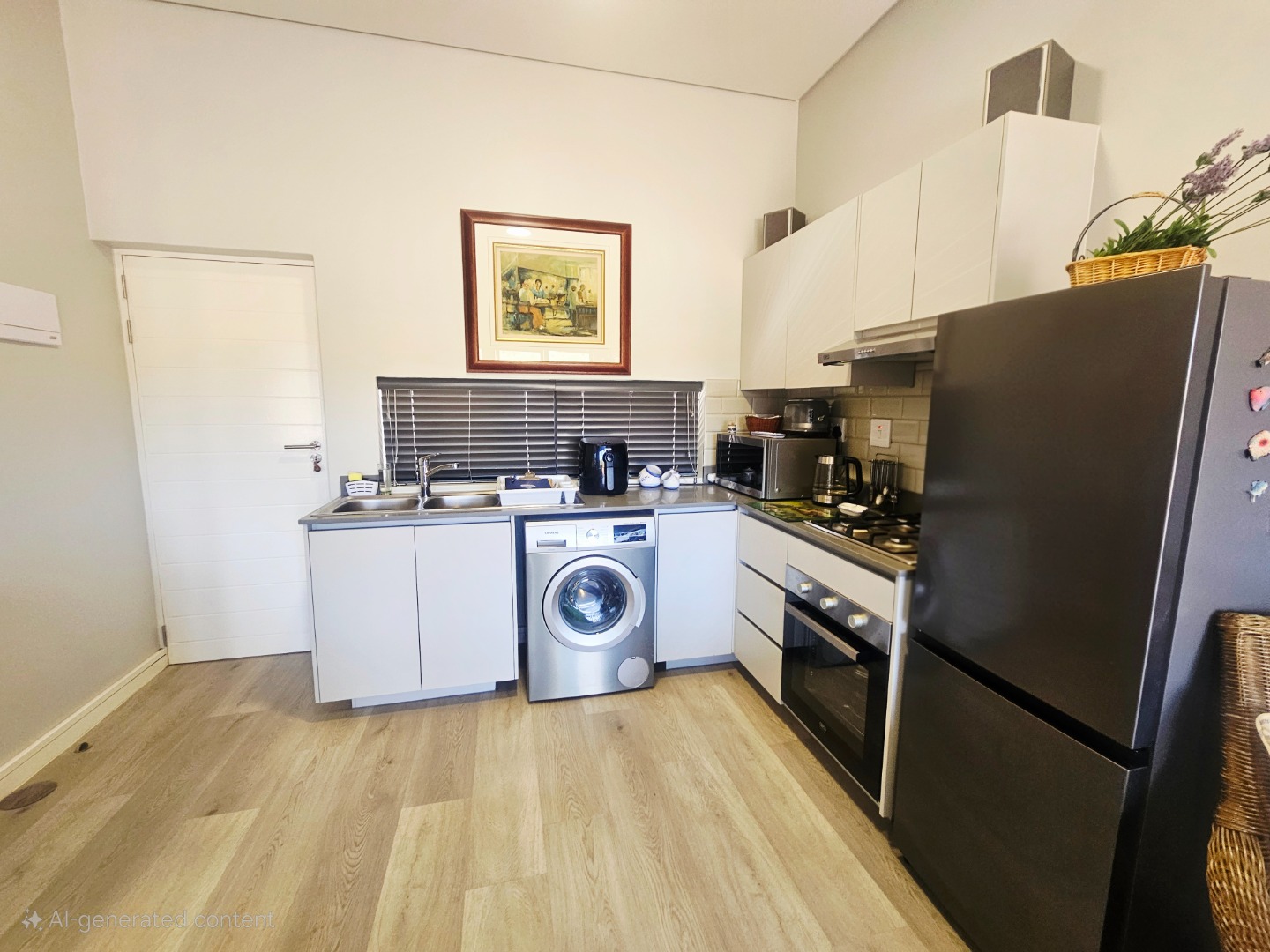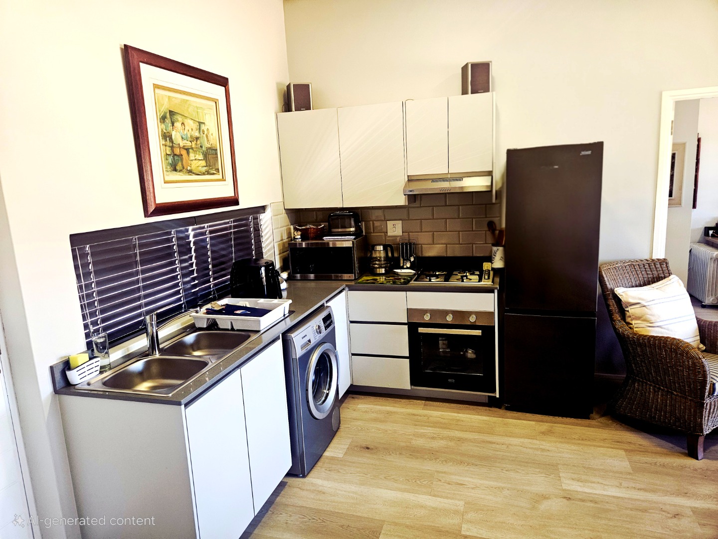 Open-plan living area flows into a modern kitchen with a washing or dishwashing machine connection and gas stove.