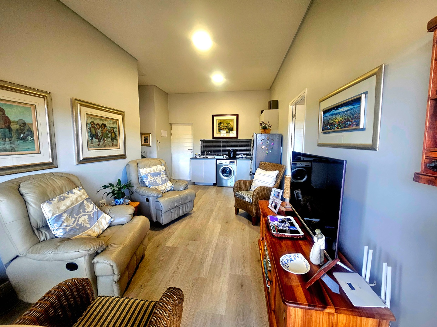 Die oopplan-leefarea vloei na ’n moderne kombuis met netjiese afwerking met skuifdeure na die balkon.