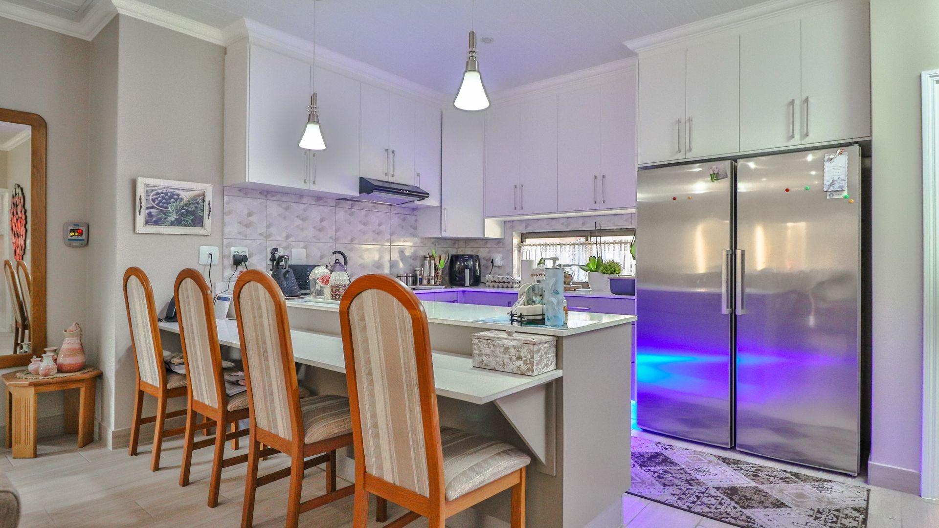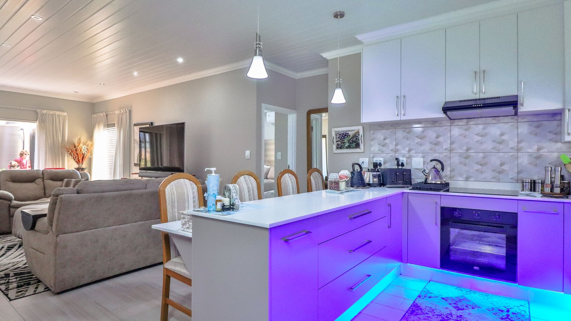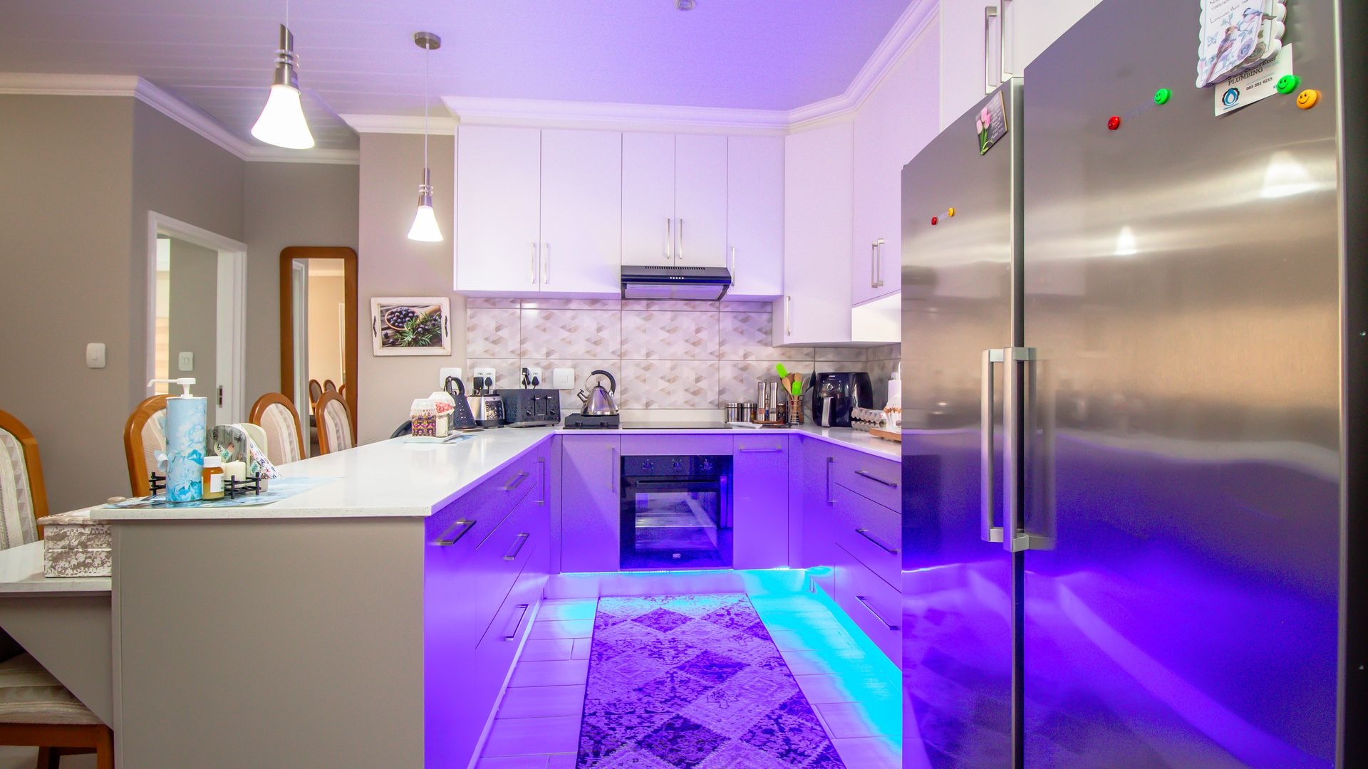 - Stylish open-plan kitchen with breakfast nook, gas/electric stove, scullery, extra-large pantry, and ambient soft blue lighting.