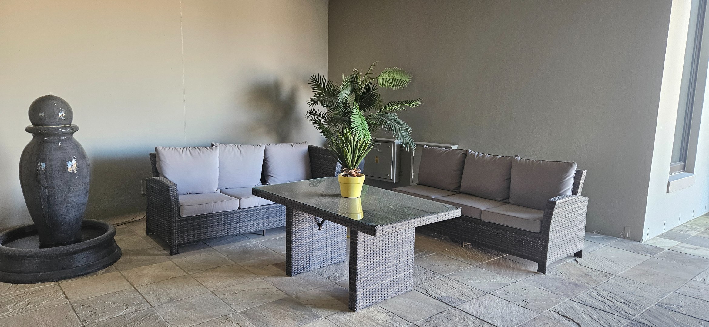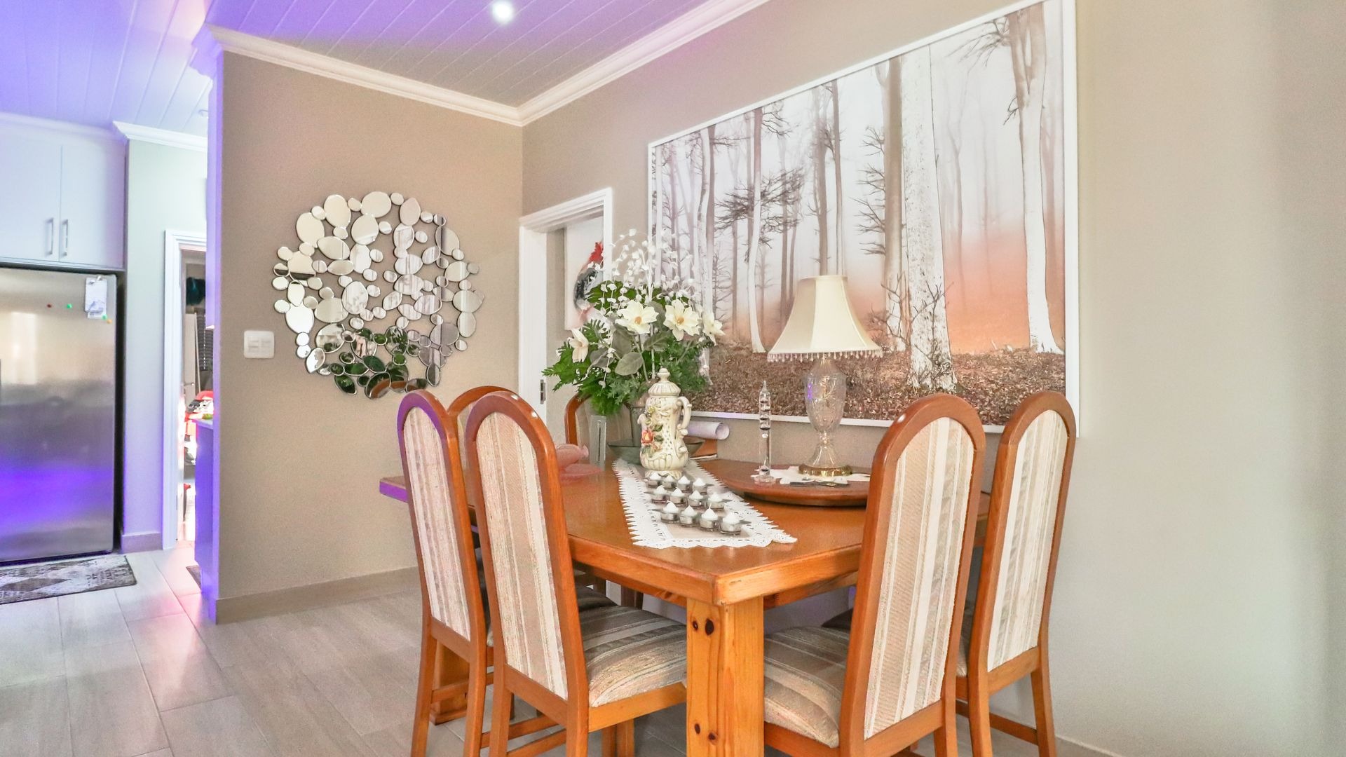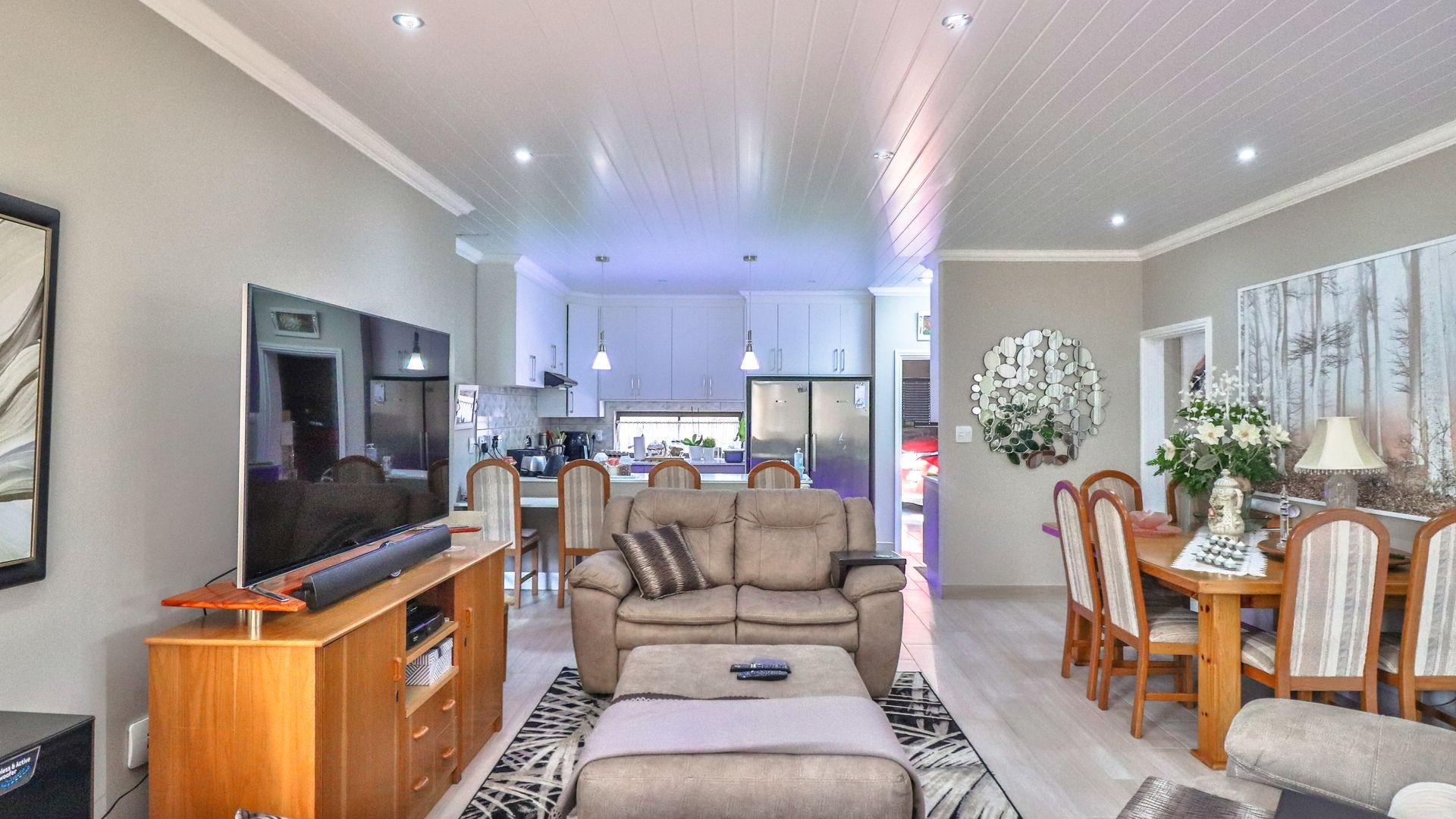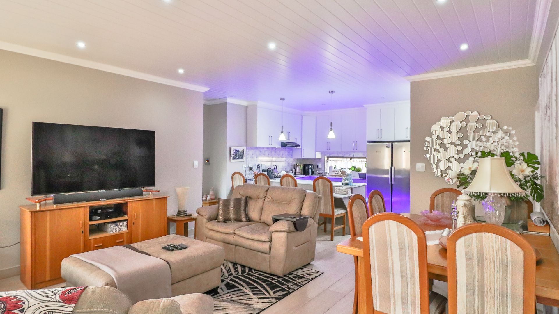 - Well-designed dining and living area with fitted dining table, TV space, and sliding doors leading to a peaceful indigenous garden.