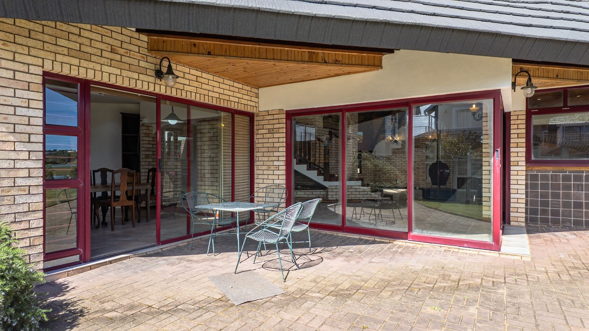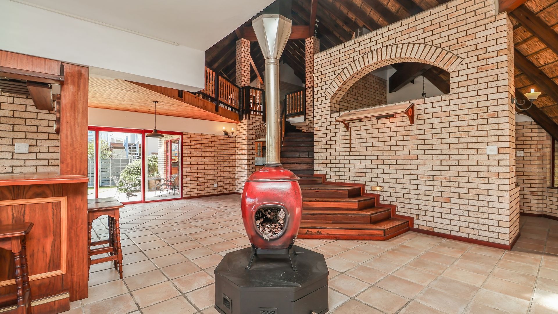 Inside, the open-plan living area includes a central ceramic fireplace, a bar that opens to the patio, and a kitchen finished with granite tops and solid Brazilian Yellowwood cabinetry. Additional features include a large study, pantry, scullery, inverter system, automated sprinklers, and thoughtful finishes throughout.