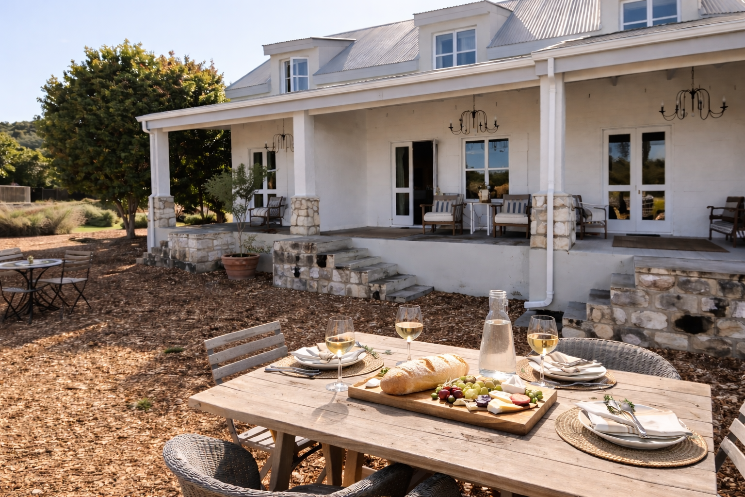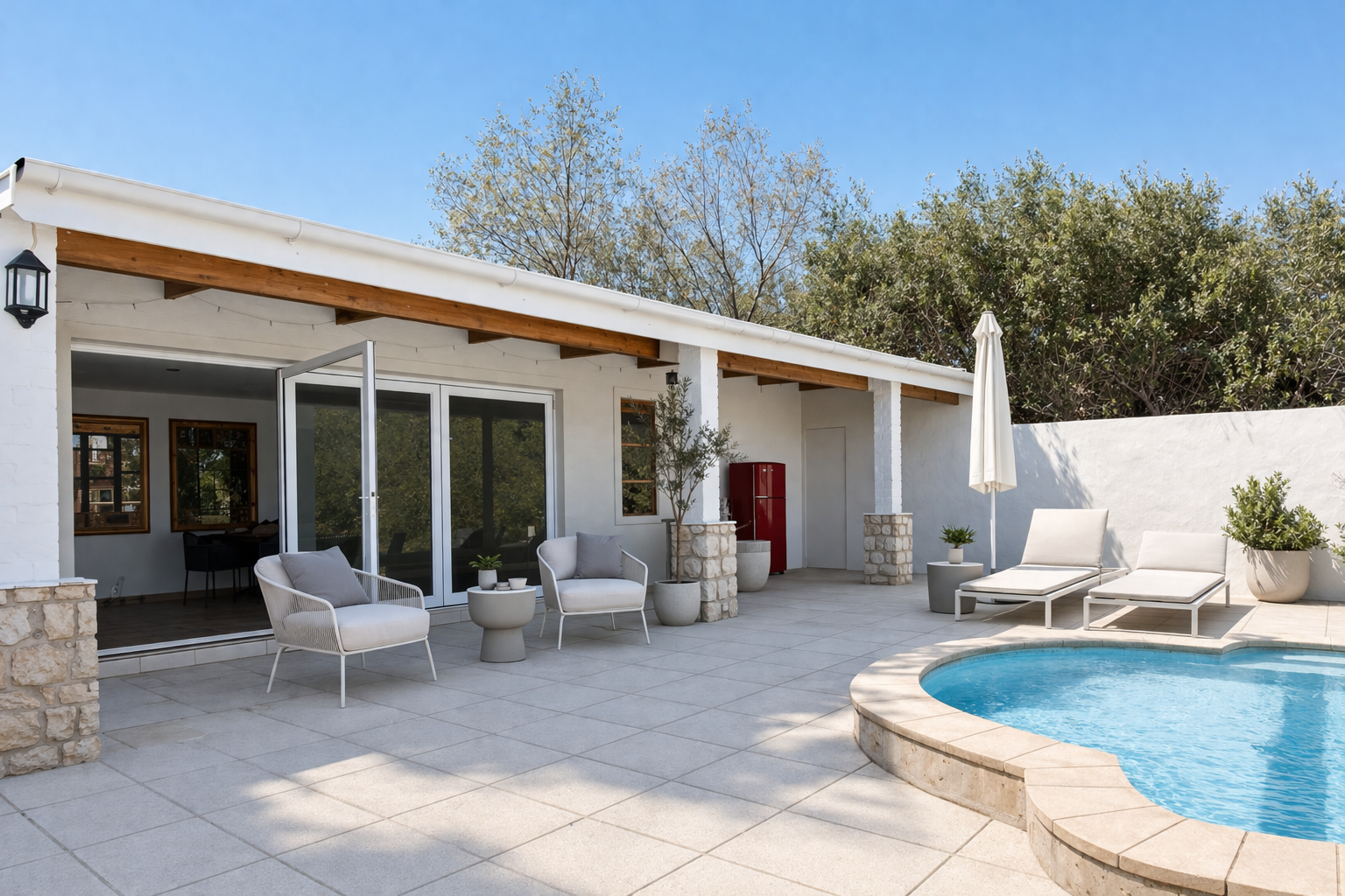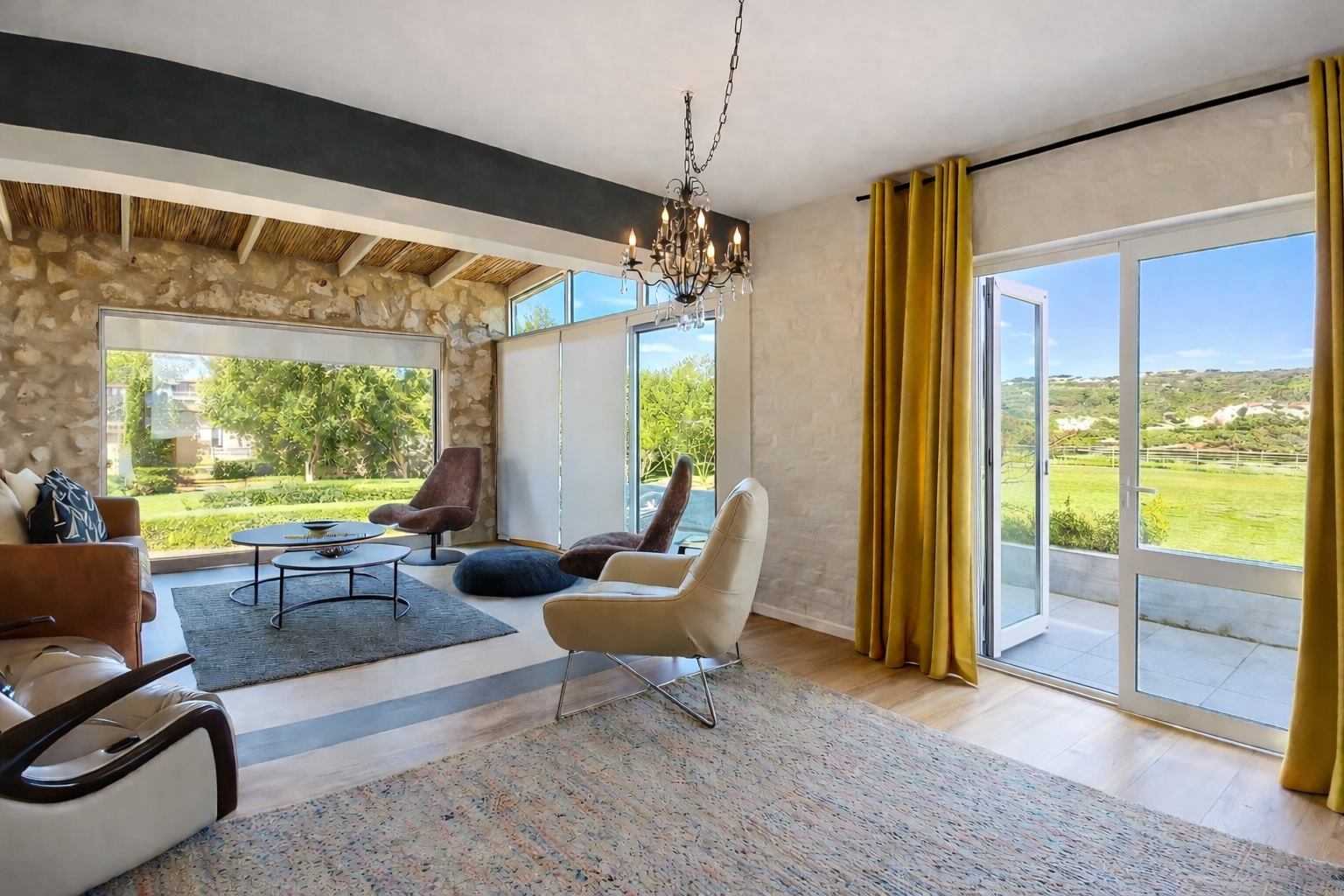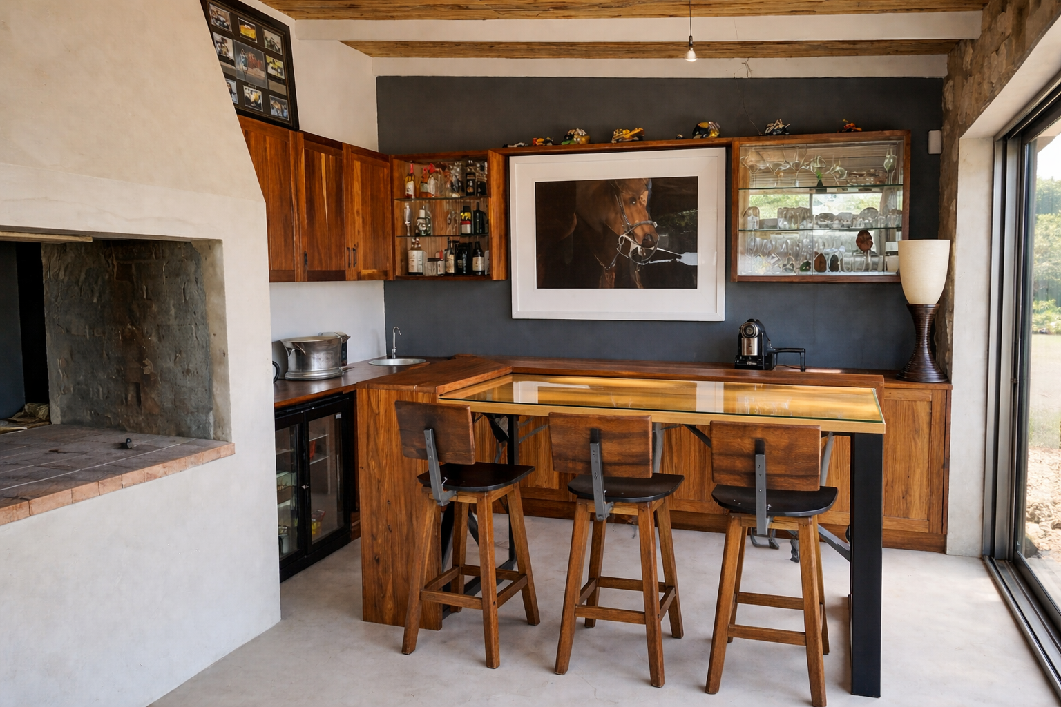 The main residence is a refined expression of timeless design and relaxed luxury. Thoughtfully curated interiors feature three spacious bedrooms, two elegant bathrooms, and expansive open-plan living areas designed for effortless entertaining. A striking dual-sided fireplace connects the living and kitchen spaces, while Spanish reed ceilings and natural stone finishes introduce warmth, texture, and character. Large windows invite natural light throughout, seamlessly blending indoor living with the surrounding landscape.