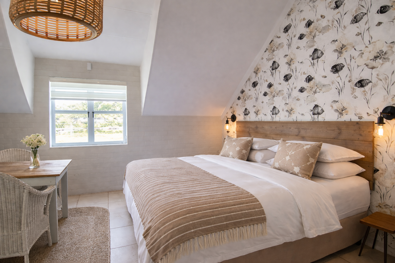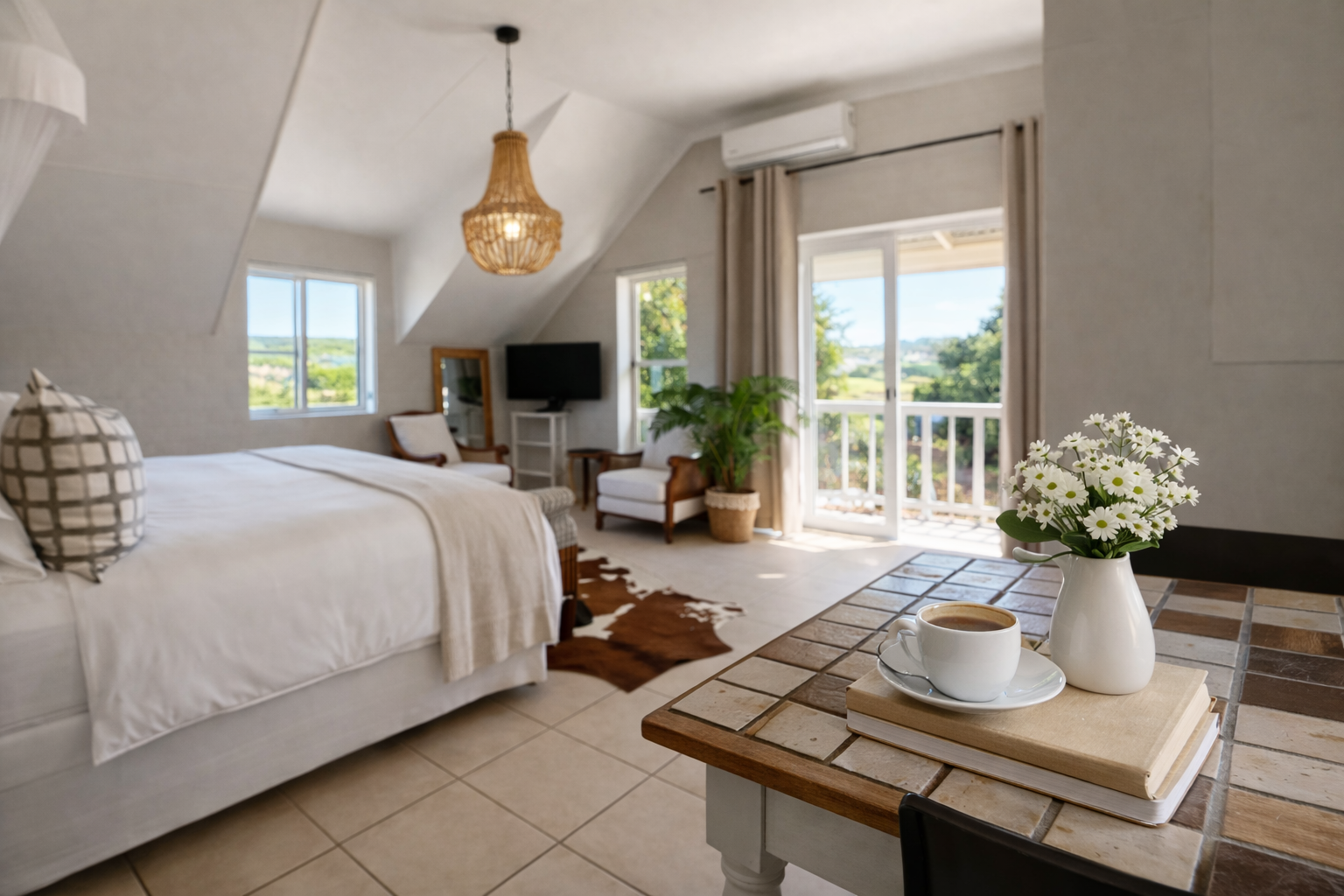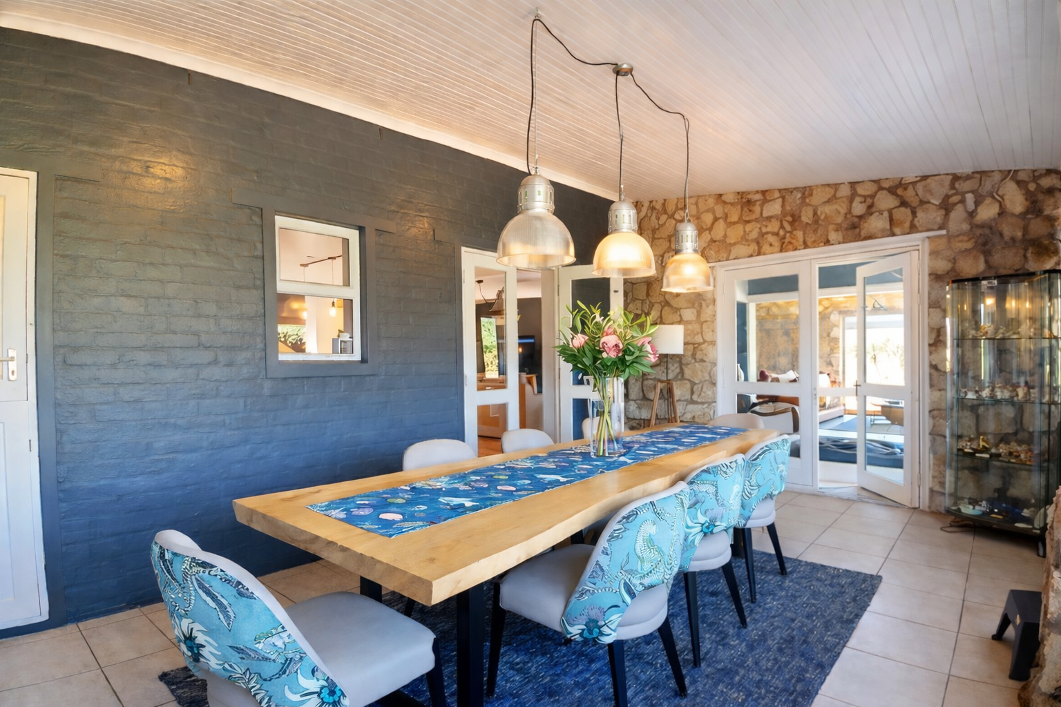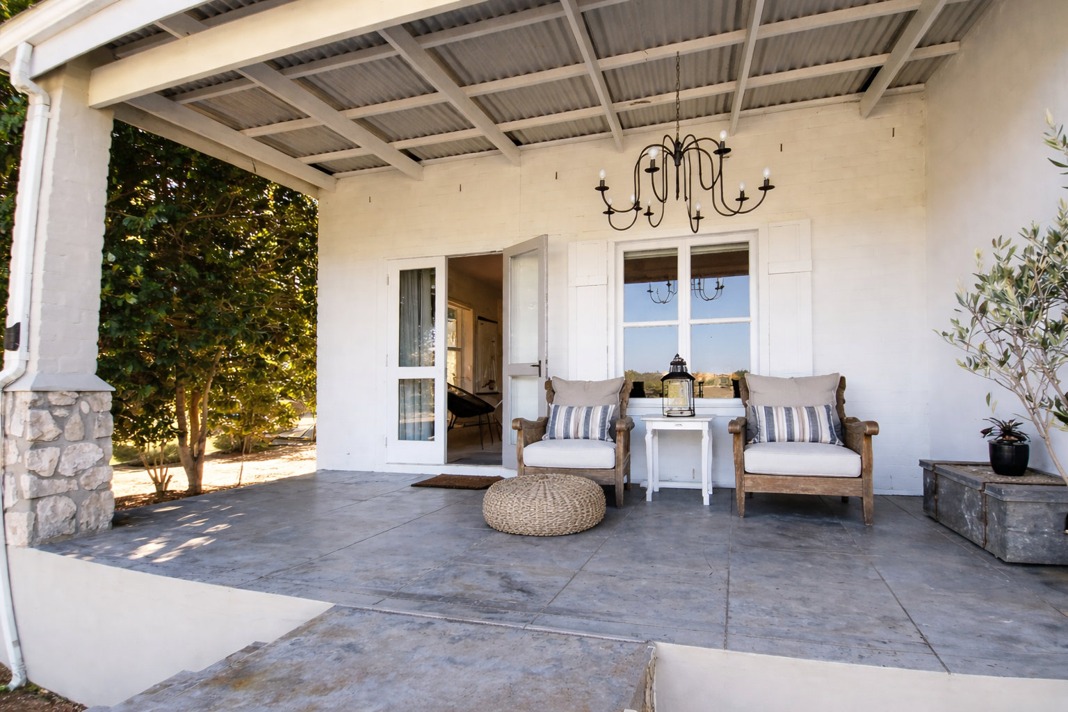 The main residence is a refined expression of timeless design and relaxed luxury. Thoughtfully curated interiors feature three spacious bedrooms, two elegant bathrooms, and expansive open-plan living areas designed for effortless entertaining. A striking dual-sided fireplace connects the living and kitchen spaces, while Spanish reed ceilings and natural stone finishes introduce warmth, texture, and character. Large windows invite natural light throughout, seamlessly blending indoor living with the surrounding landscape.