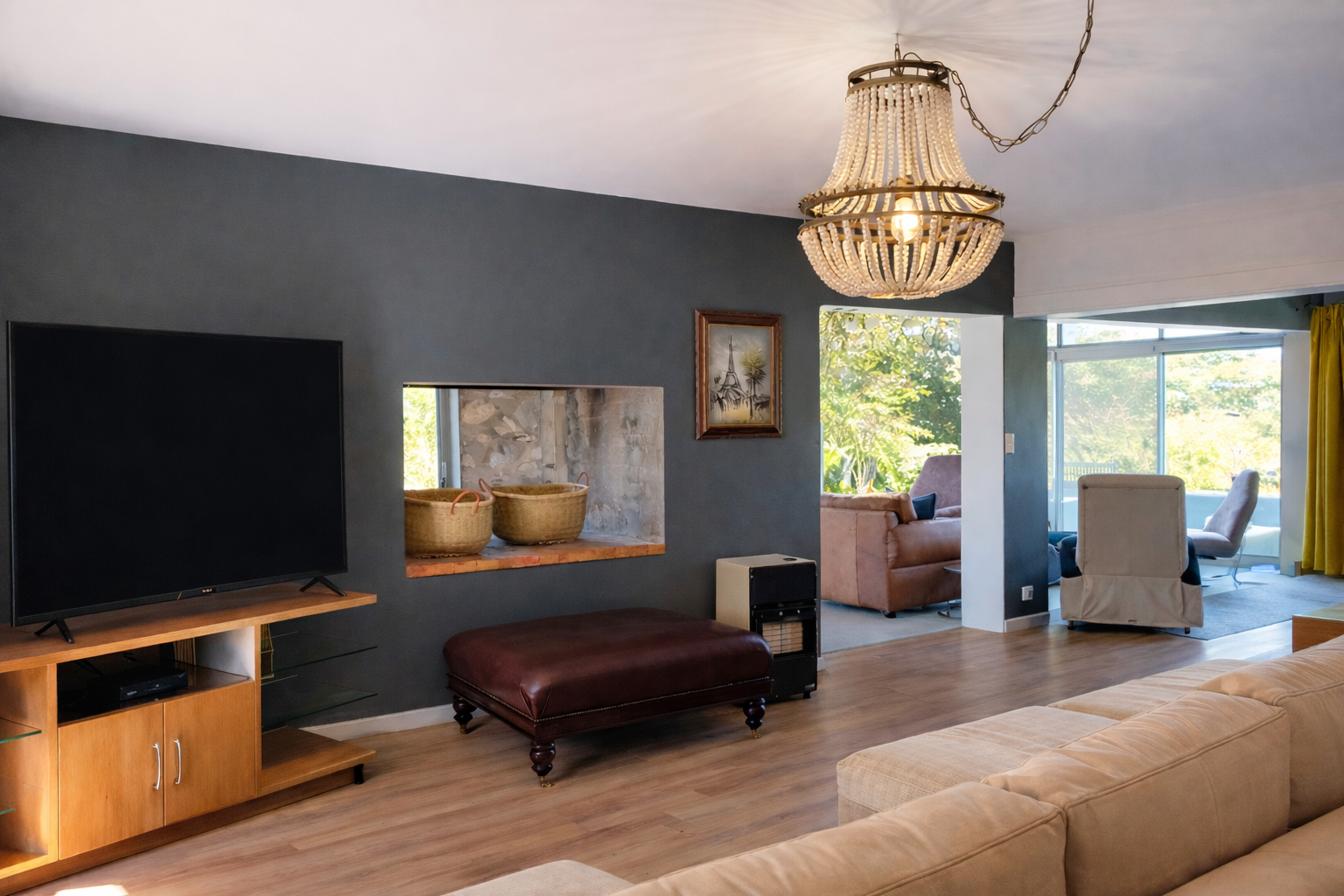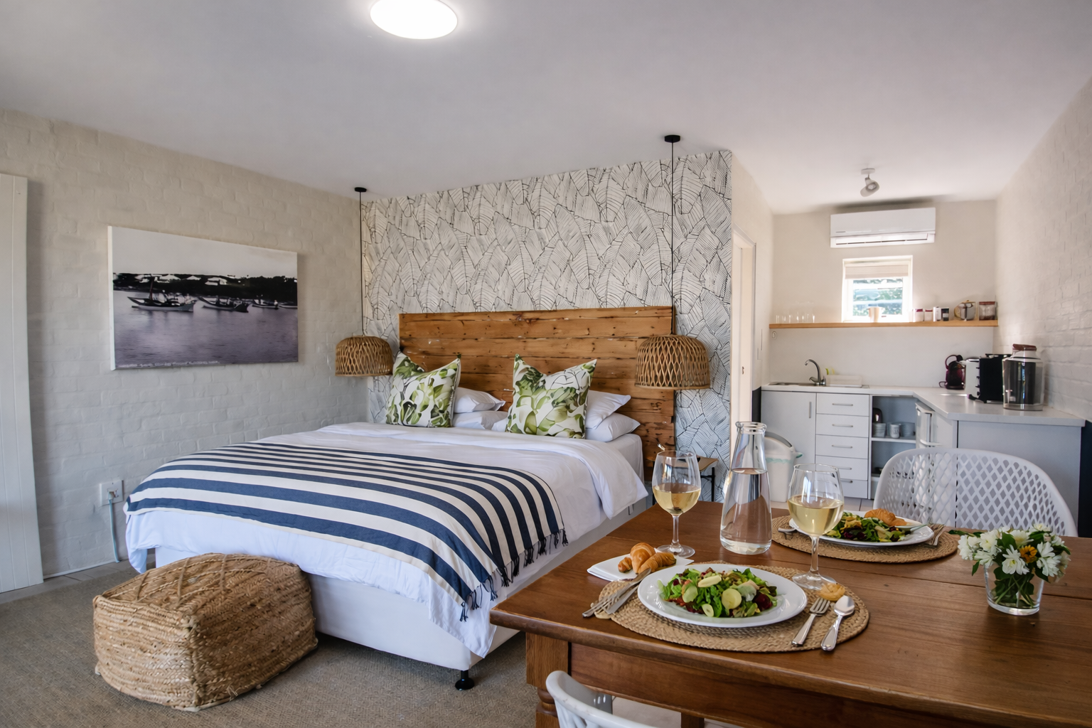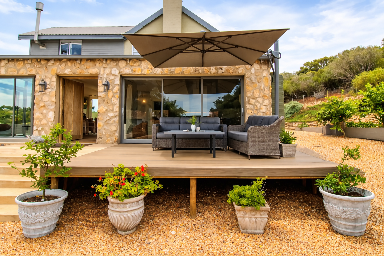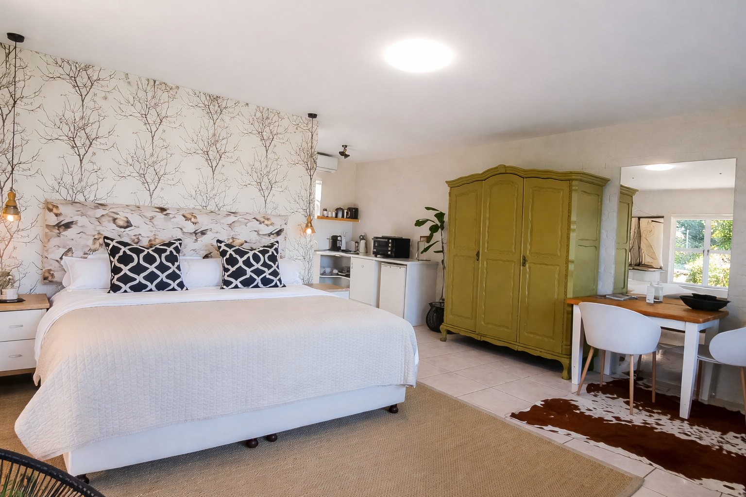 The main residence is a refined expression of timeless design and relaxed luxury. Thoughtfully curated interiors feature three spacious bedrooms, two elegant bathrooms, and expansive open-plan living areas designed for effortless entertaining. A striking dual-sided fireplace connects the living and kitchen spaces, while Spanish reed ceilings and natural stone finishes introduce warmth, texture, and character. Large windows invite natural light throughout, seamlessly blending indoor living with the surrounding landscape.