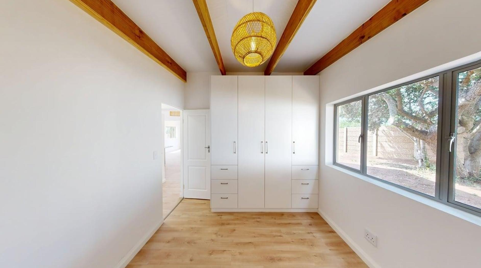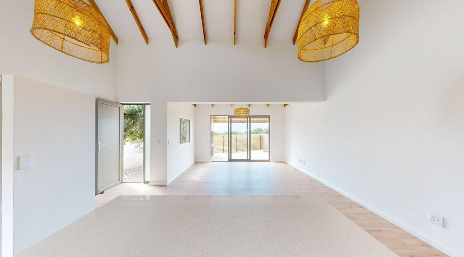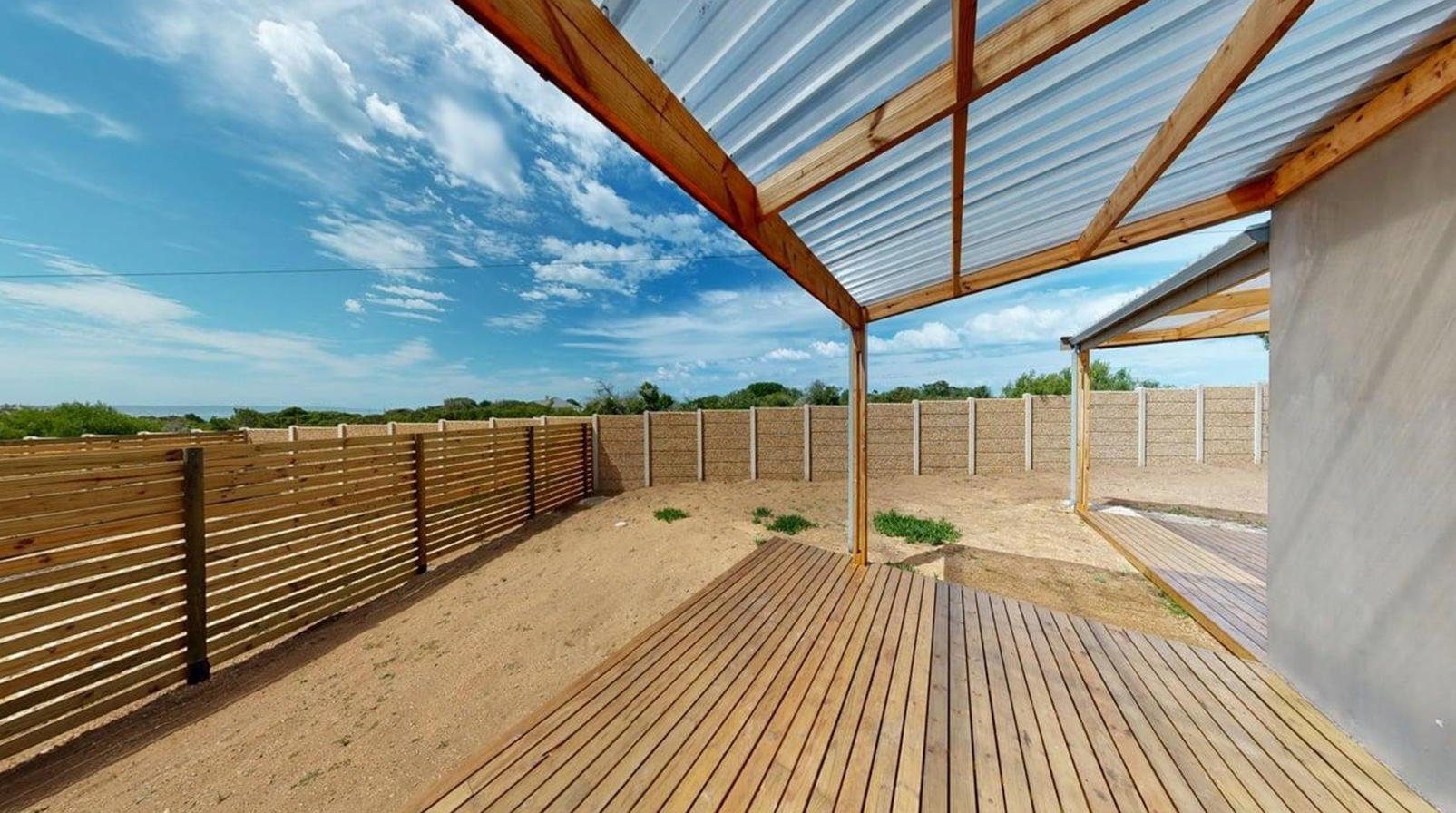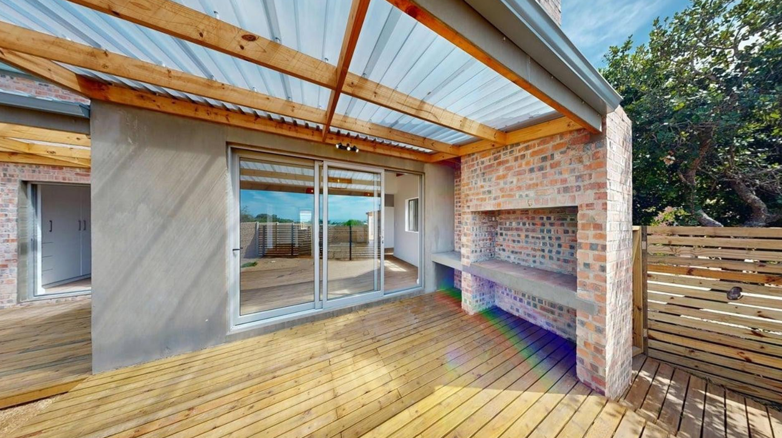 Sliding doors open onto a private covered patio with a built-in braai, providing the ideal setting for outdoor dining and soaking up Stilbaai's laid-back coastal vibe.