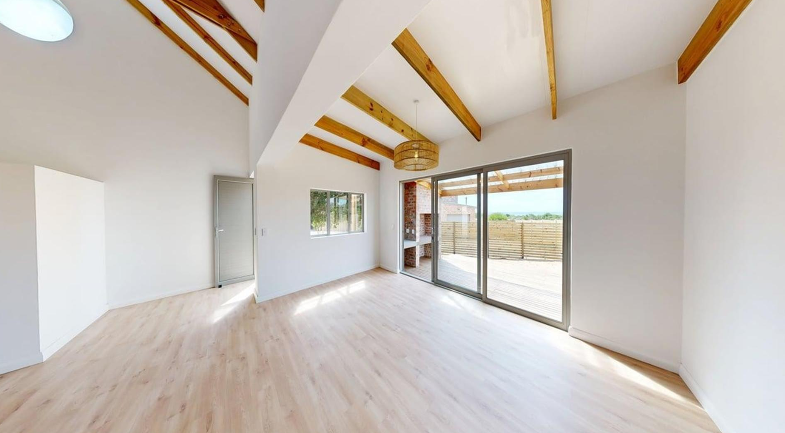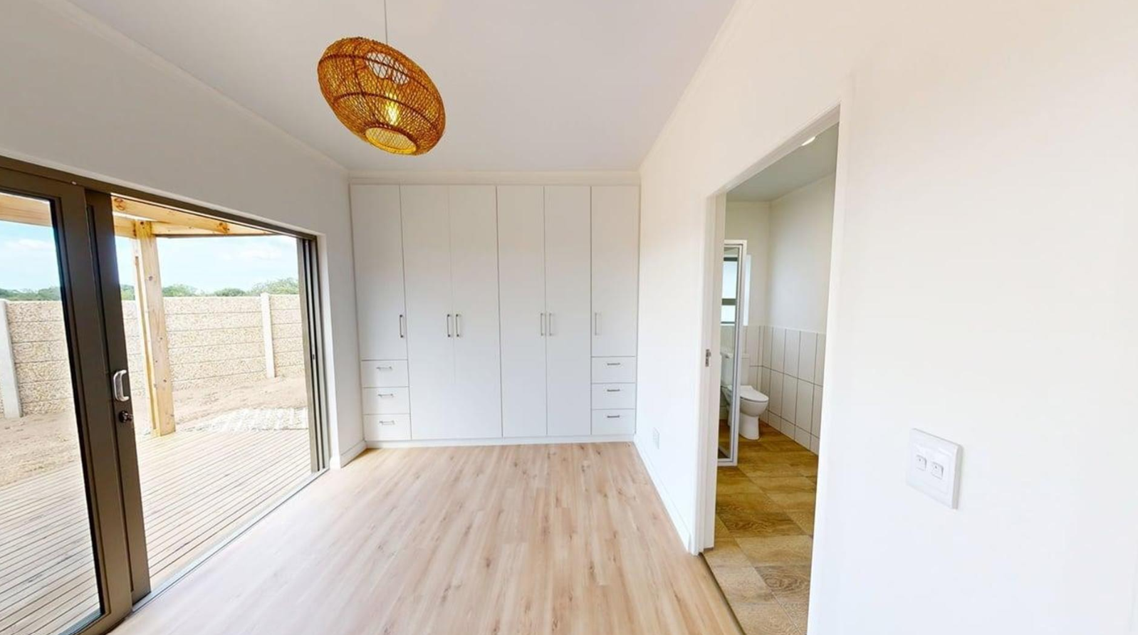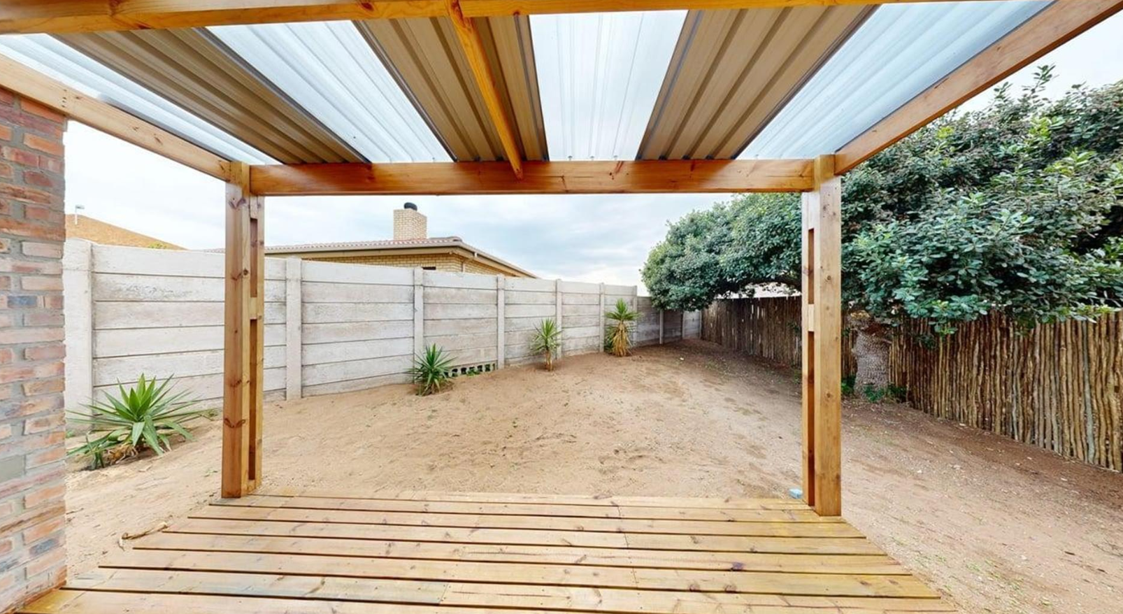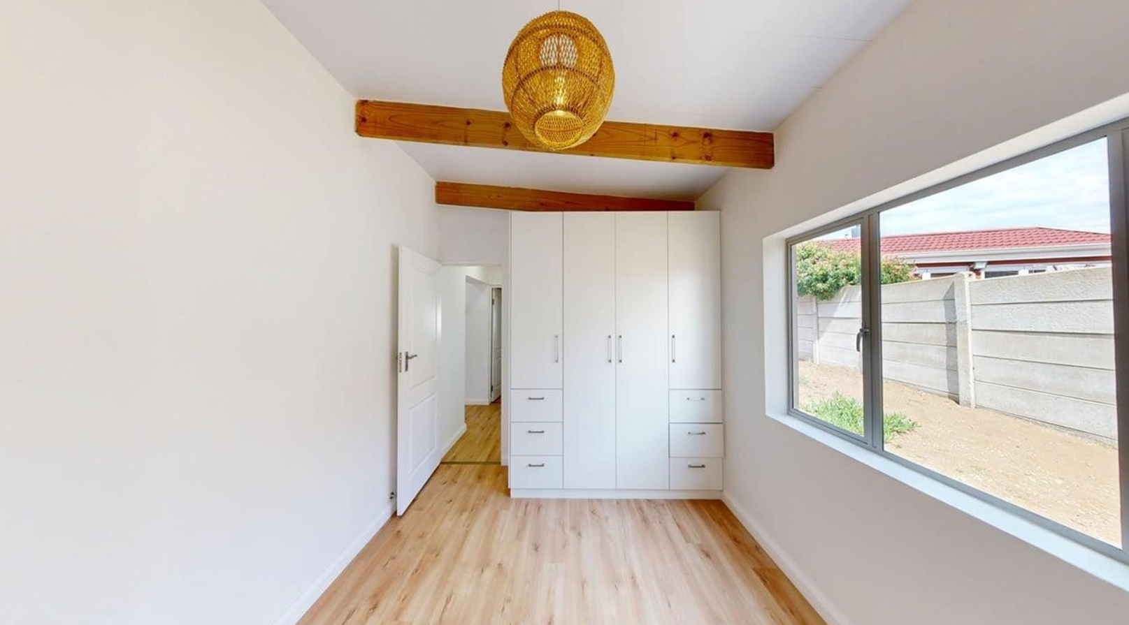 Sliding doors open onto a private covered patio with a built-in braai, providing the ideal setting for outdoor dining and soaking up Stilbaai's laid-back coastal vibe.