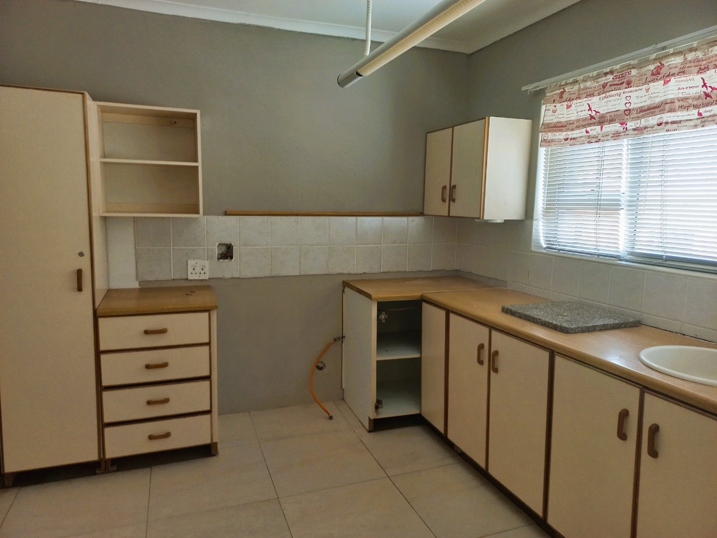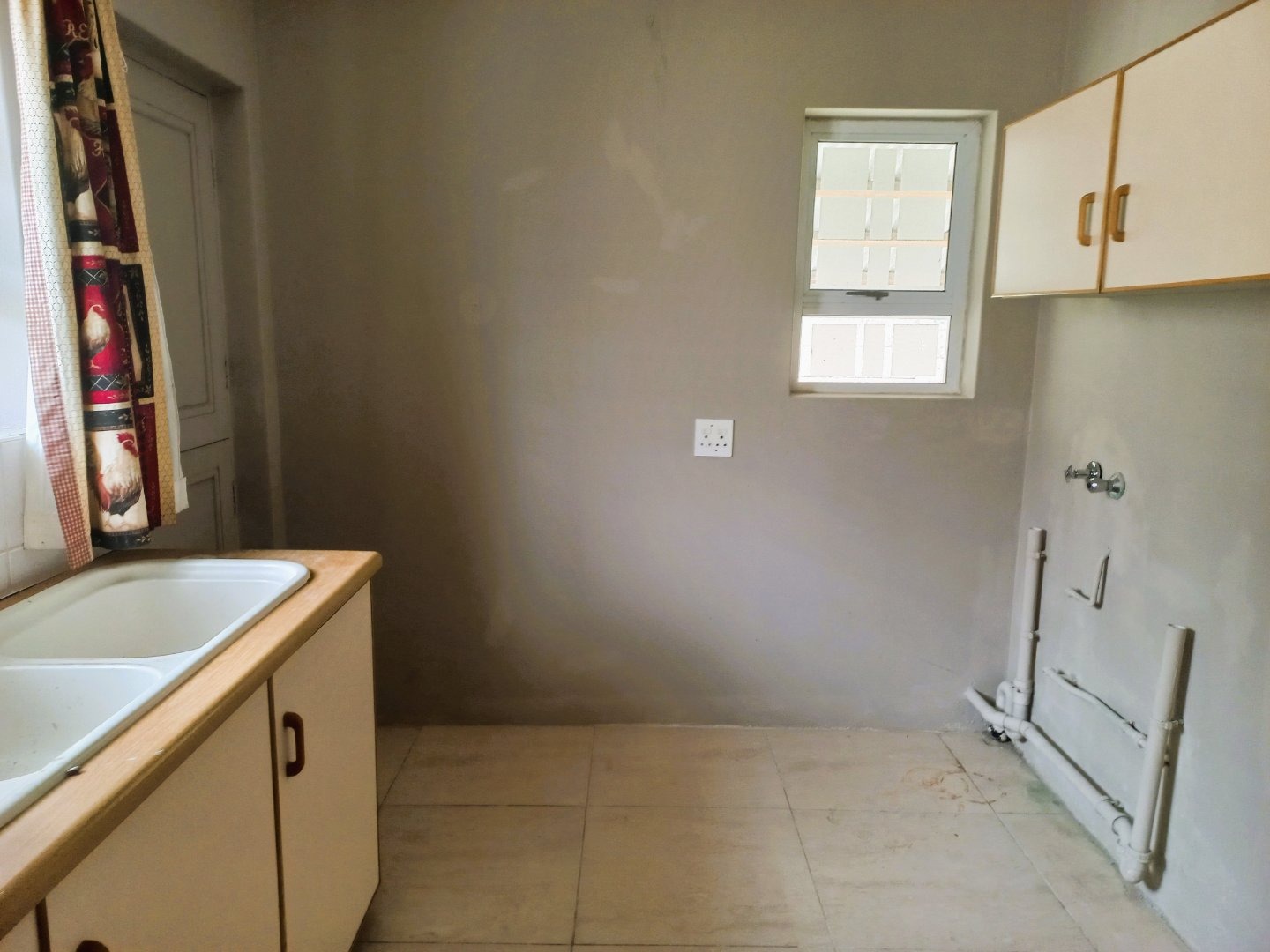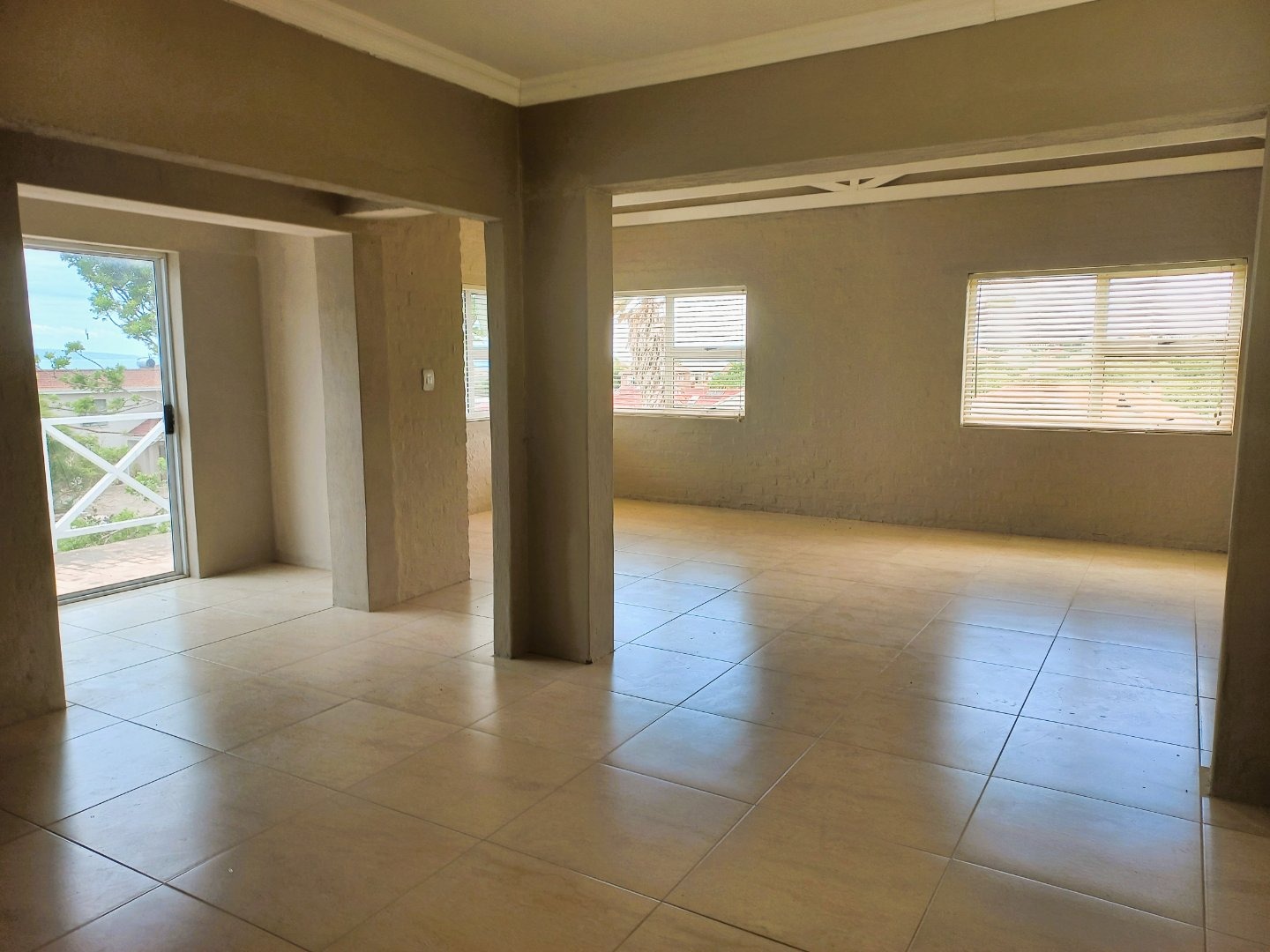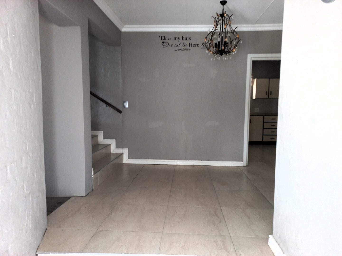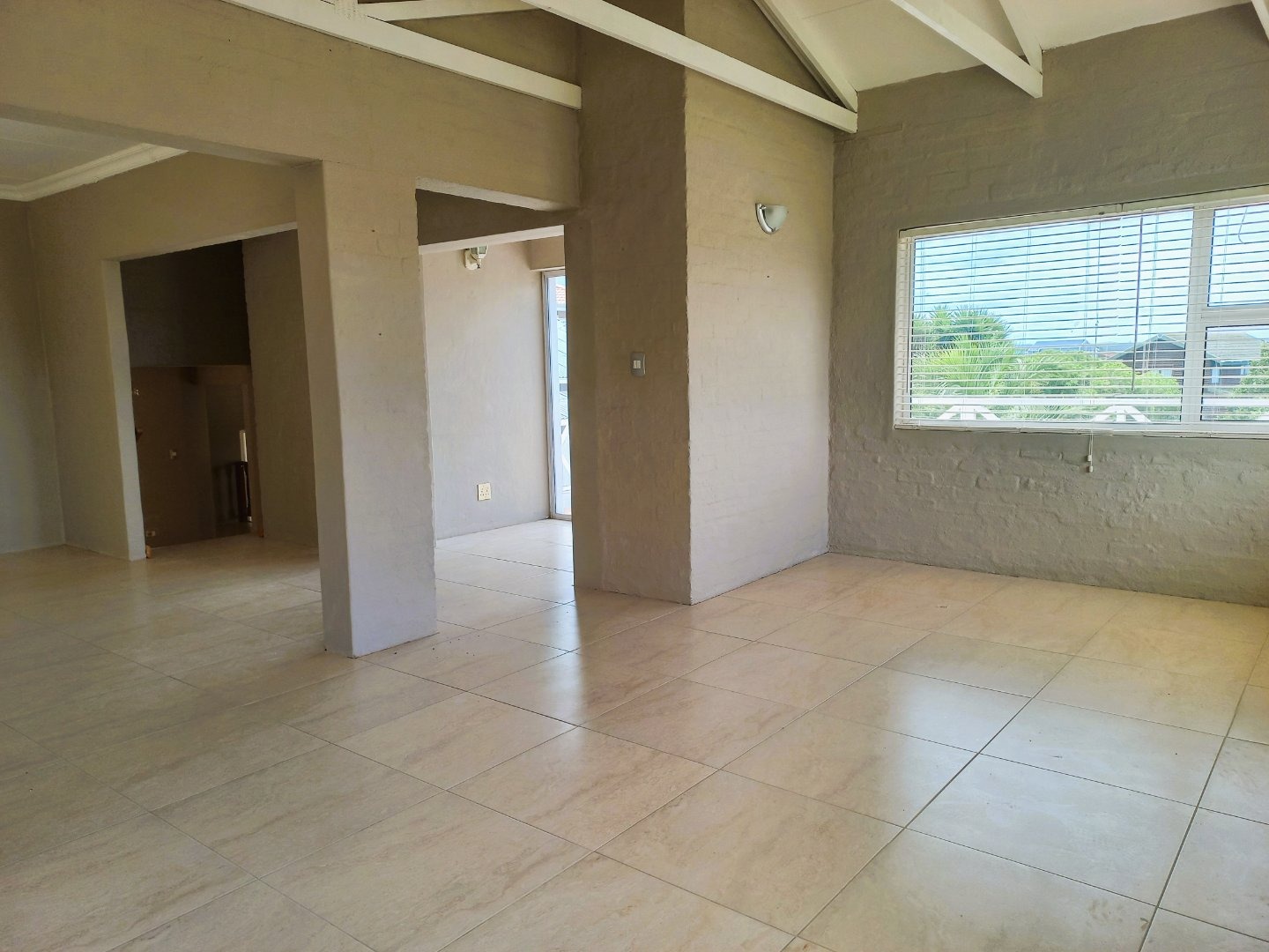 Inside, the home boasts a functional layout designed for comfortable living. The entryway welcomes you with neutral-toned tiled flooring and a decorative chandelier, leading to bright, spacious living areas. These spaces benefit from ample natural light, neutral walls, and durable tiled floors. High vaulted ceilings with exposed beams create an airy atmosphere, particularly in the open-plan areas. A sliding glass door opens to an outdoor area, revealing a distant sea view, perfect for enjoying the coastal breeze. The kitchen, while offering ample cabinet and counter space, presents an opportunity for modernization to align with contemporary tastes.