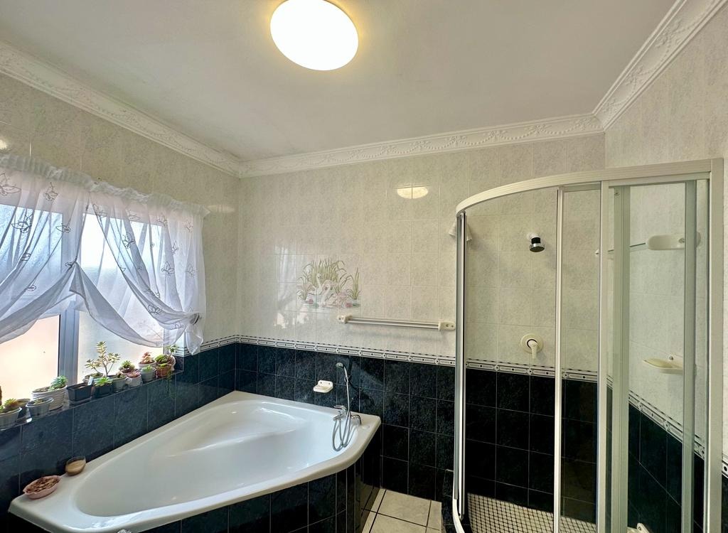 This expansive 4-bedroom, 3-bathroom residence in Stilbaai Wes offers a generous 326 sqm of living space on a 768 sqm erf. The home features an open-plan layout seamlessly connecting living, dining, and kitchen areas. Large windows and sliding doors invite abundant natural light, creating a bright atmosphere. With two spacious lounges and a dedicated dining room, there is ample space for relaxation and entertaining. The well-appointed kitchen boasts extensive wooden cabinetry, durable granite countertops, and a functional island with an integrated stovetop, complemented by a large stainless steel refrigerator and double oven. Four comfortable bedrooms, two en-suite, are provided, alongside a third full bathroom. Each bedroom offers built-in wardrobes and several benefit from direct balcony access, offering scenic views. Step outside to the spacious tiled patio and balconies, complete with modern glass railings, where you can enjoy distant ocean views and tranquil surroundings. The property is well-equipped for vehicles, featuring four garages and additional parking for four cars. A well-maintained garden provides a pleasant outdoor space for leisure. Practical features include a battery inverter and water tanks, enhancing self-sufficiency. Pets are allowed, making it a welcoming home. Located in this desirable coastal area, the property offers a scenic setting with easy beach access and local amenities, ideal for a holiday home or permanent residence. Key Features: * 4 Bedrooms, 3 Bathrooms (2 en-suite) * 4 Garages, 4 Parking spaces * 2 Lounges, 1 Dining Room * Spacious open-plan living * Distant ocean views from balconies * Large erf (768 sqm) and floor size (326 sqm) * Battery inverter and water tanks * Coastal beach location