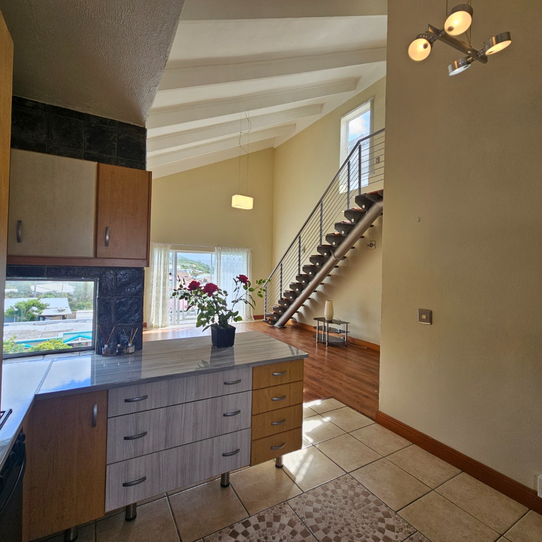 The home features two spacious bedrooms with built-in cupboards, a neat bathroom setup, and an open-plan kitchen that flows into a bright living area. Upstairs, you'll find a loft perfect for a study and private rooftop braai area—ideal for entertaining, enjoying sundowners, or simply soaking in the sea breeze.