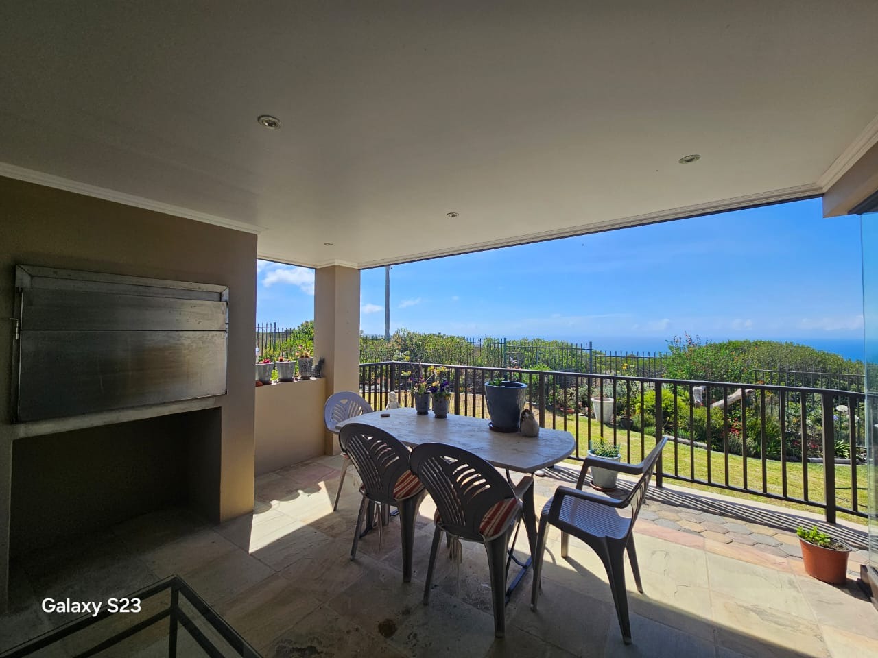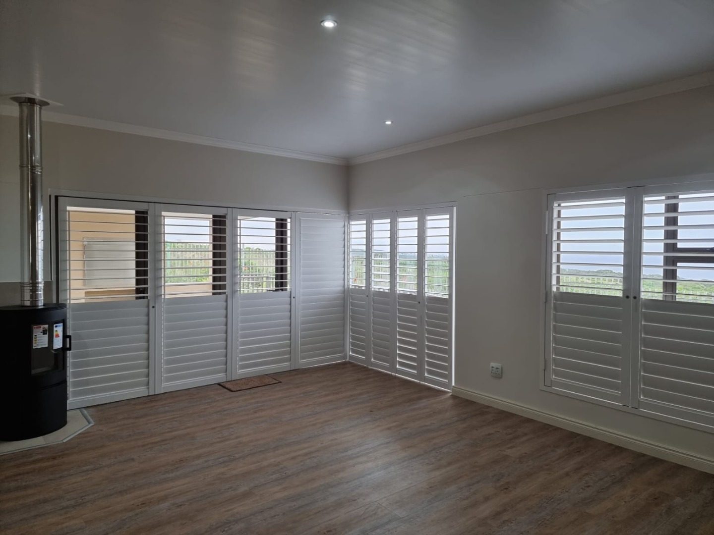 Spacious, open plan living area with a fire place. Stacking doors with american shutters, leads to a secluded patio and braai area to entertain friends and family.