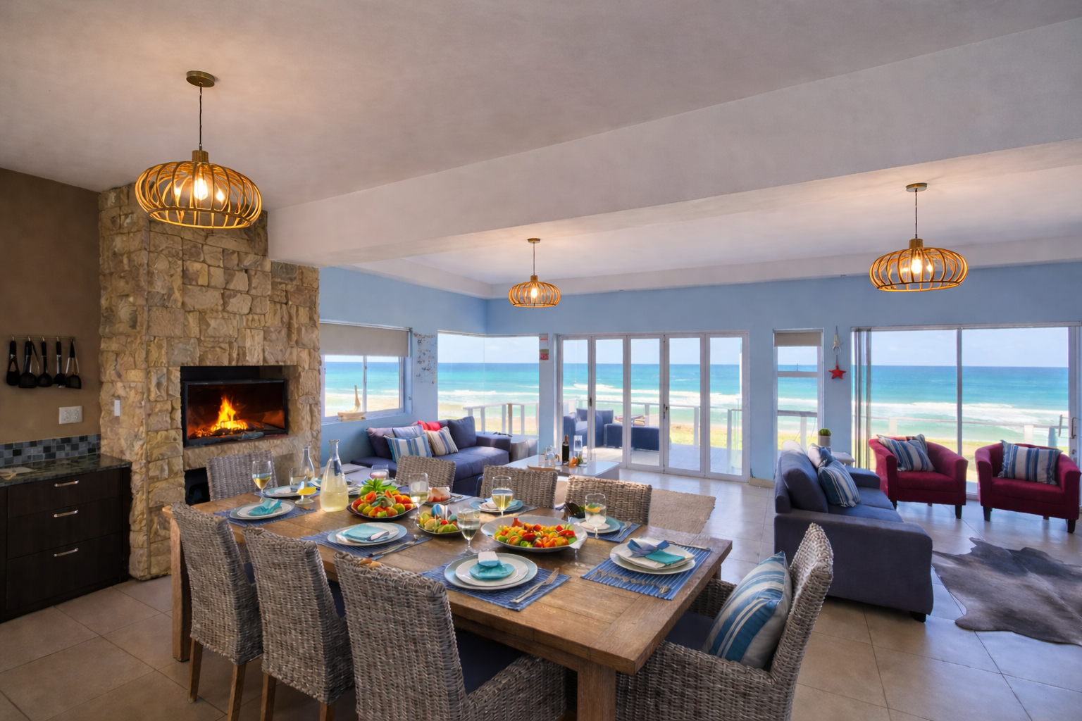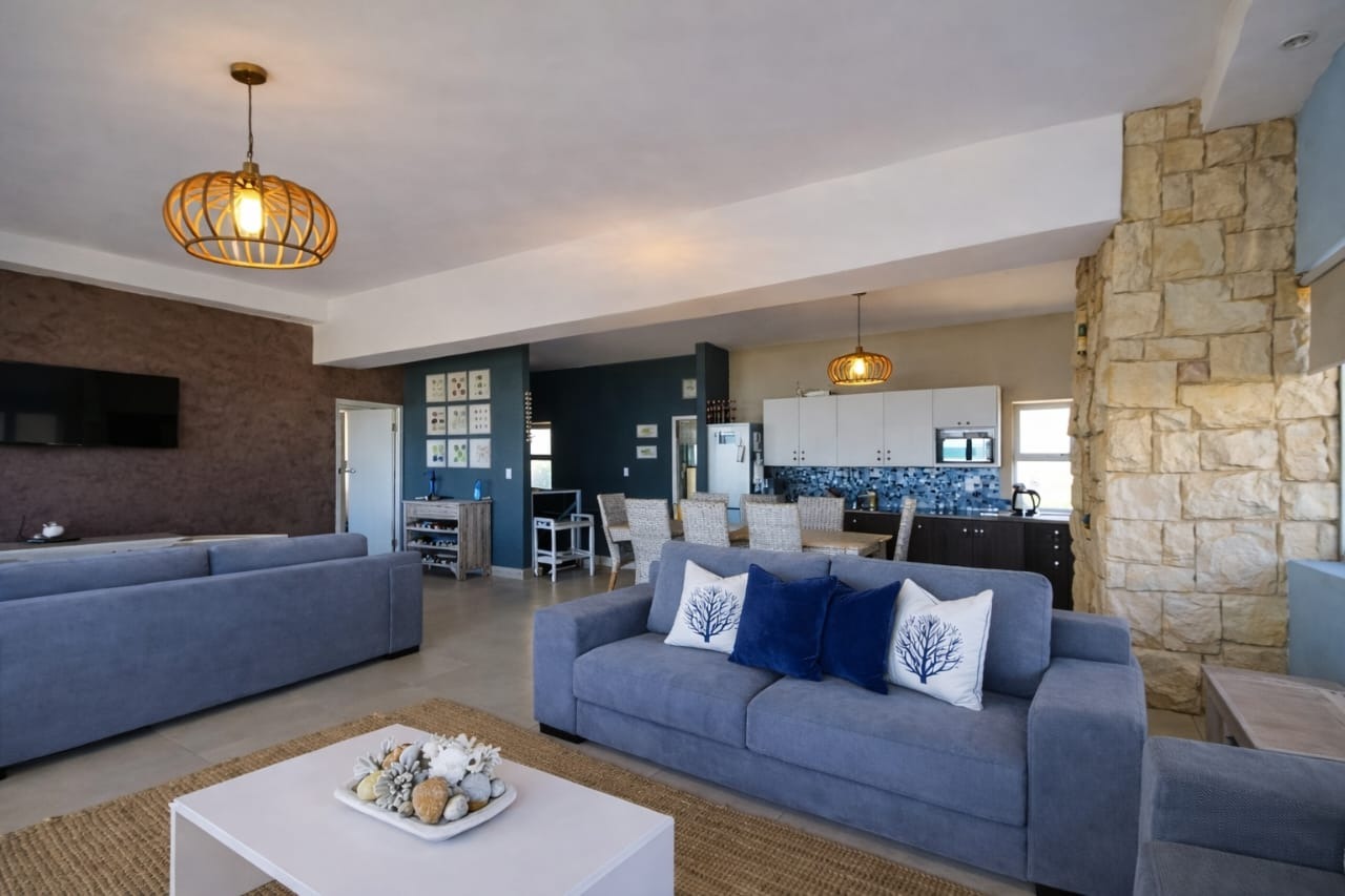 Designed to impress, the top floor is a light-filled, open-plan space where kitchen, dining, and living areas seamlessly connect — all framed by sweeping ocean views. Entertain with ease around the built-in braai, or simply unwind while soaking in the ever-changing seascape.