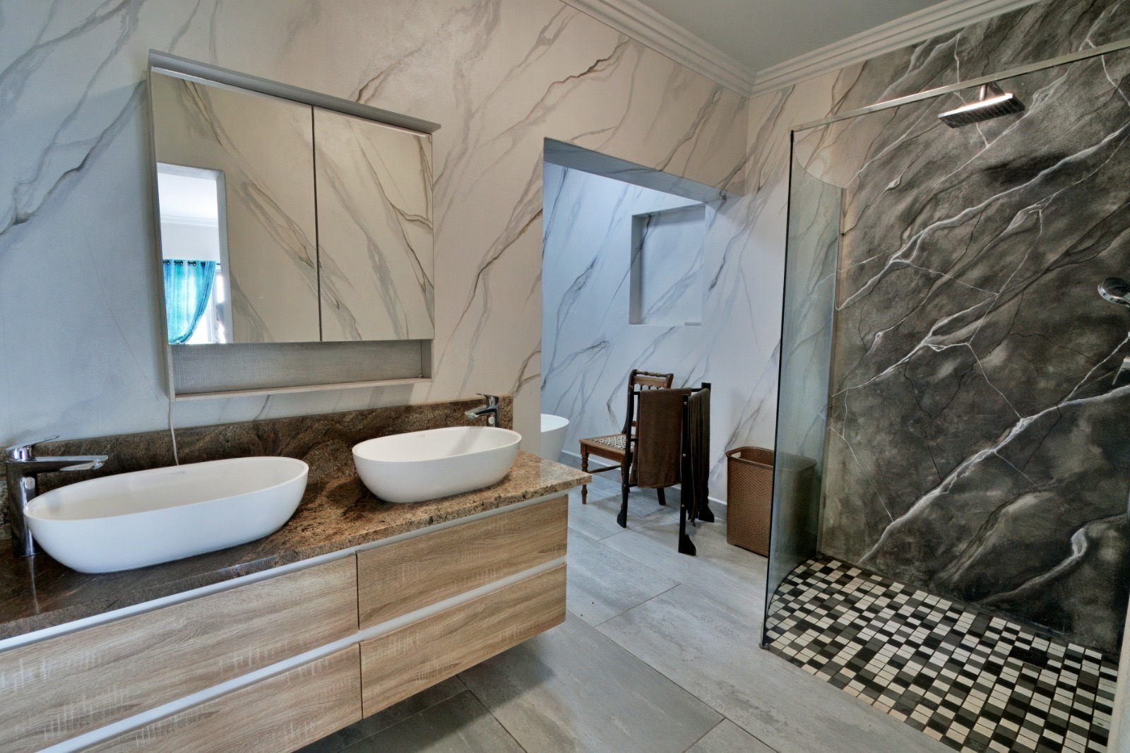 Designed for comfort, space and effortless entertaining, the home offers expansive rooms with high ceilings and a welcoming open-plan living area featuring a cozy indoor braai. The well-appointed kitchen boasts wood and melamine cabinetry, elegant granite countertops, a pantry and a separate laundry, and is equipped with a gas stove and electric oven.